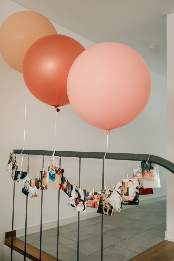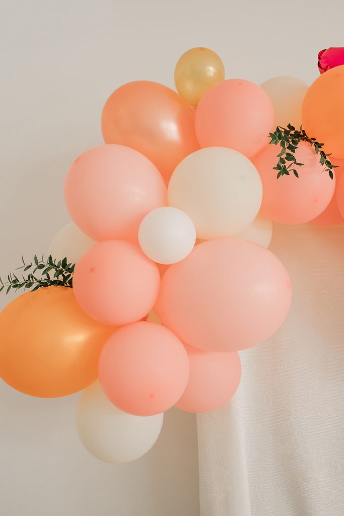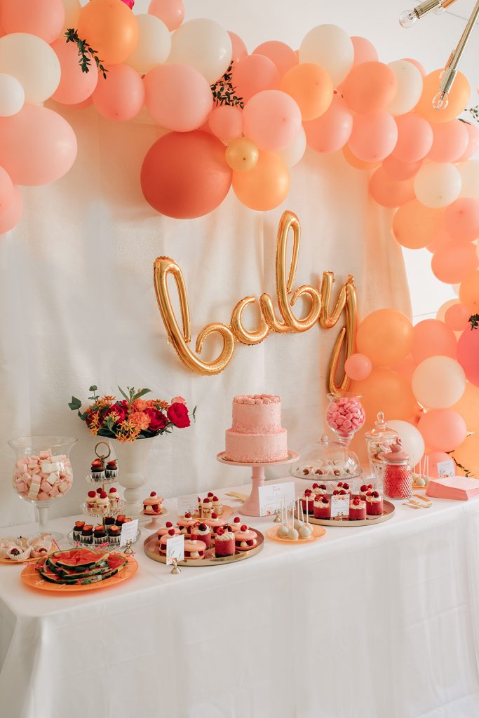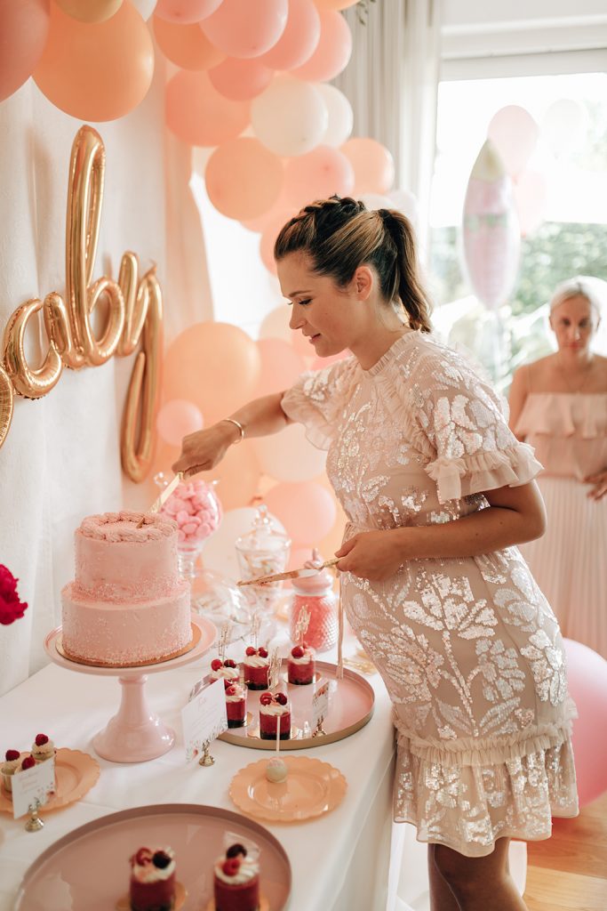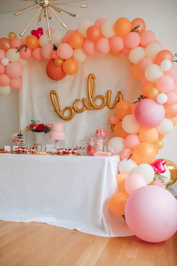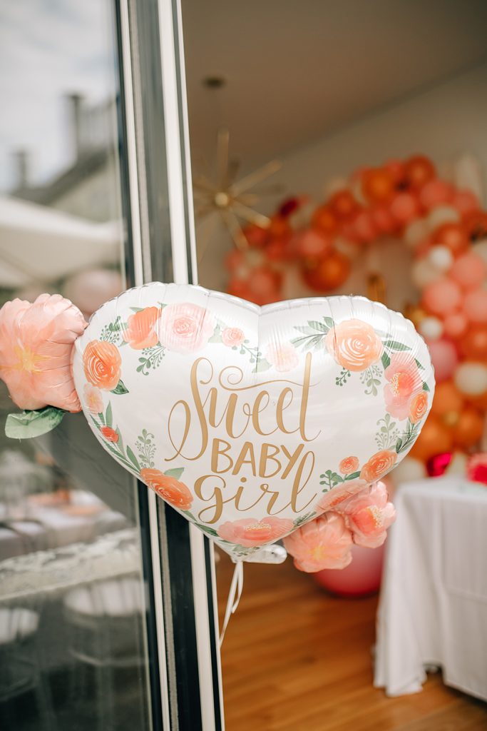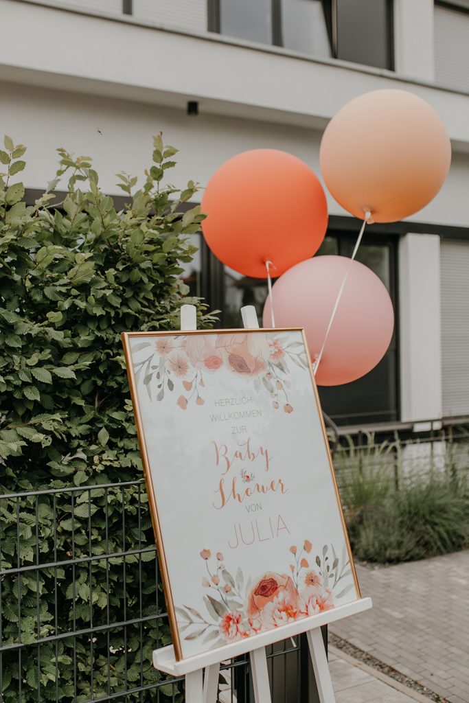 Julia & Christian wünschten sich eine Baby Shower in Sorbetfarben – also Pfirsich- und Rosatöne, etwas Pink und Orange als Akzente. Zentrale Deko sollte ein Sweet Table mit allerlei süßen Köstlichkeiten sein. Gesagt, getan! An einem Samstag im Juli haben wir dann alles vorbereitet – weiße Bentwood Chairs wurden geliefert, Torte & Sweets (Cup Cakes, Éclairs, Tarteletts, Macarons) abgeholt, Luftballons und Girlanden aufgehängt und eine Limonadenbar aufgebaut. Um den Sweet Table so richtig zur Geltung zu bringen, haben wir vor Ort eine moderne Ballongirlande als “Rahmen” installiert. Als die Freundinnen dann am Nachmittag eintrafen, wurde erstmal mit Sekt (für die Braut natürlich ohne Alkohol) angestoßen und viele Fotos gemacht… Die Mädels und Mamas hatten einen unvergesslichen Nachmittag mit Spielen, Torte, Limo und Sekt…