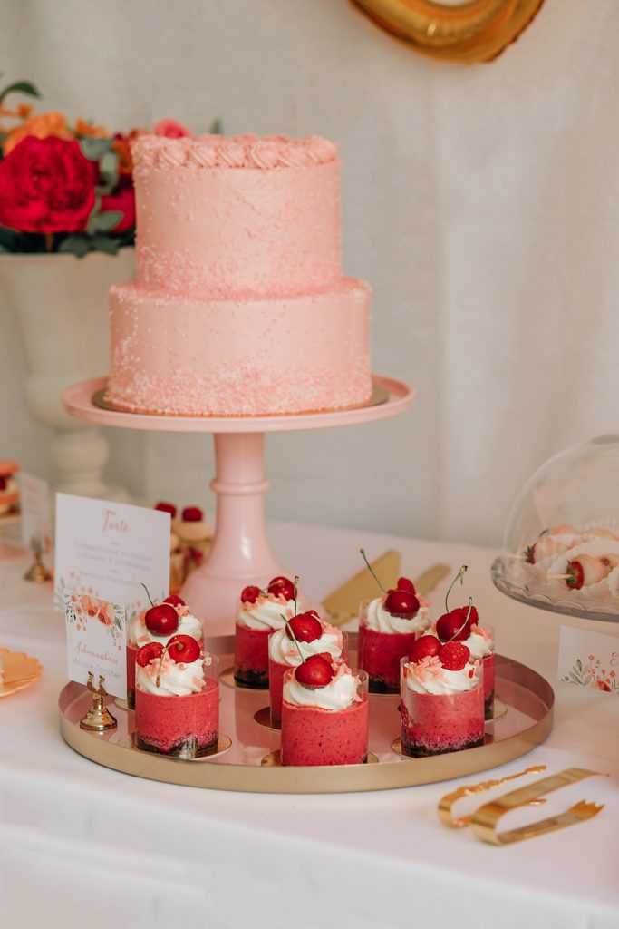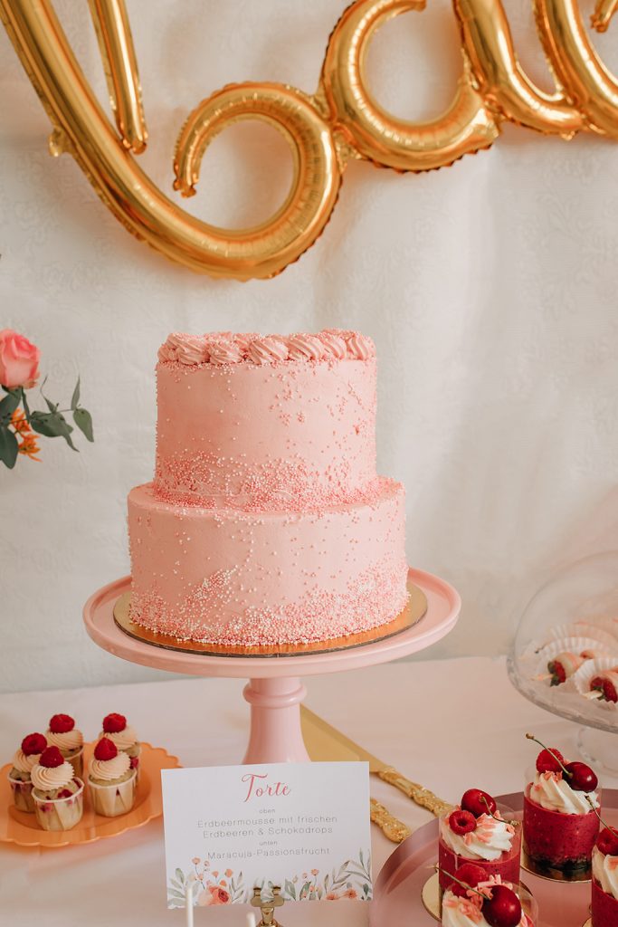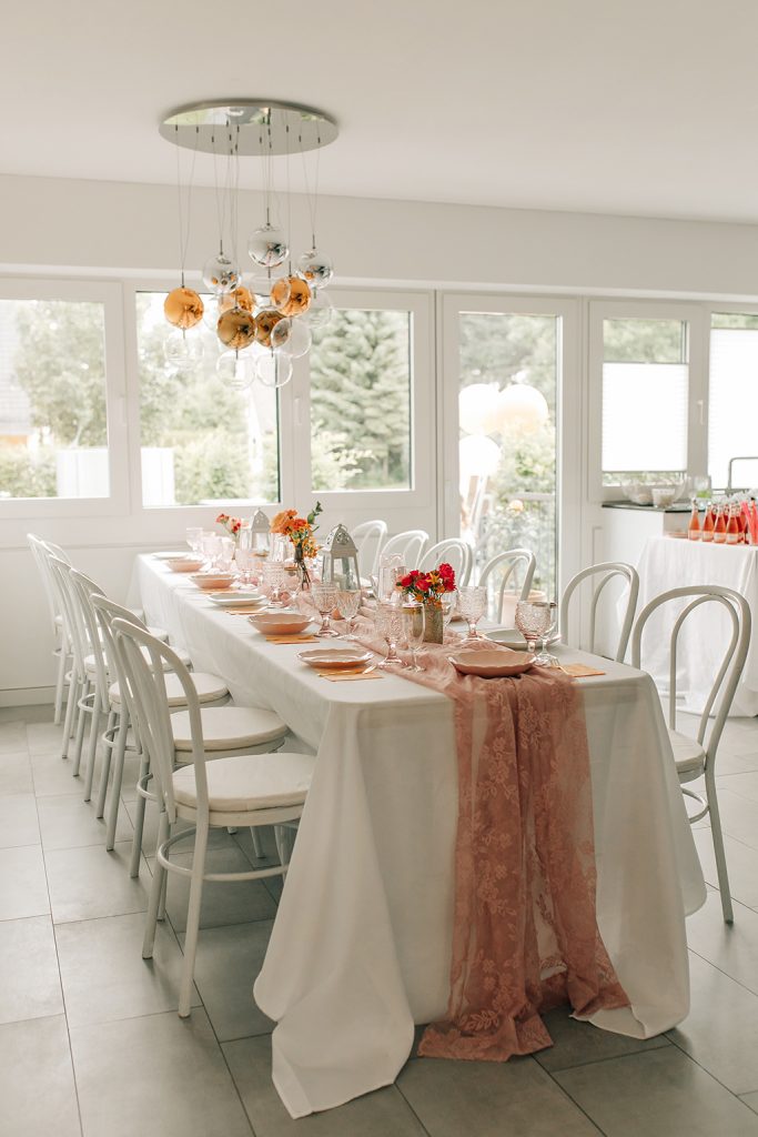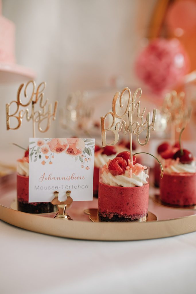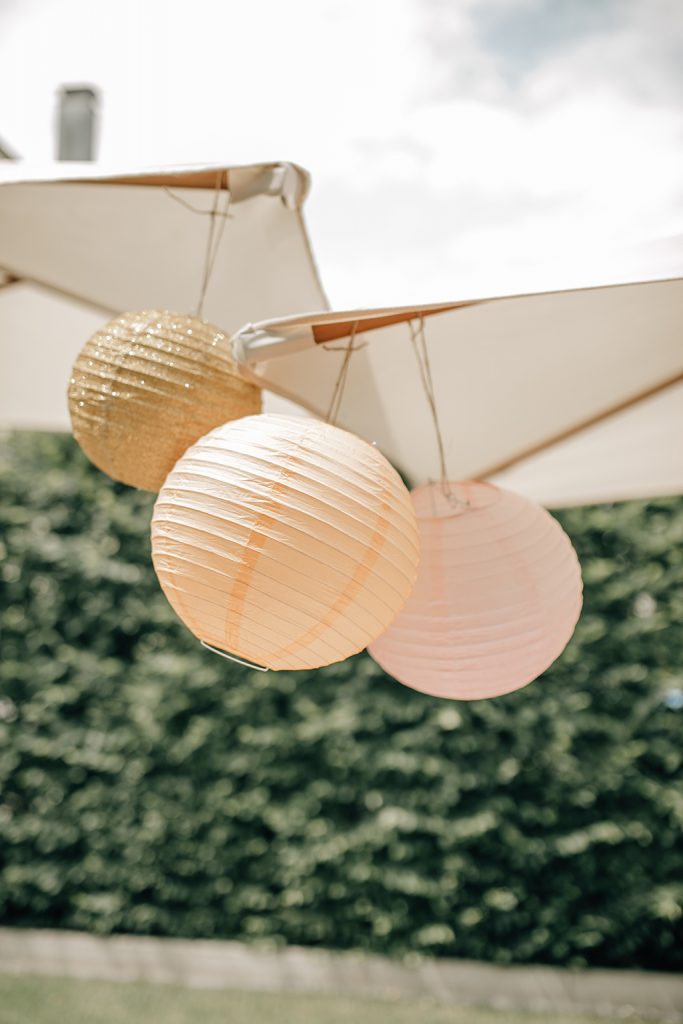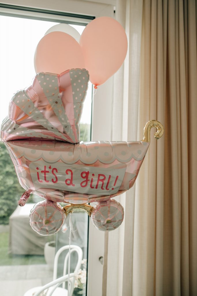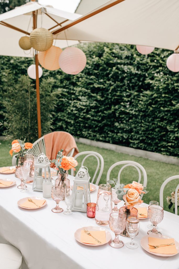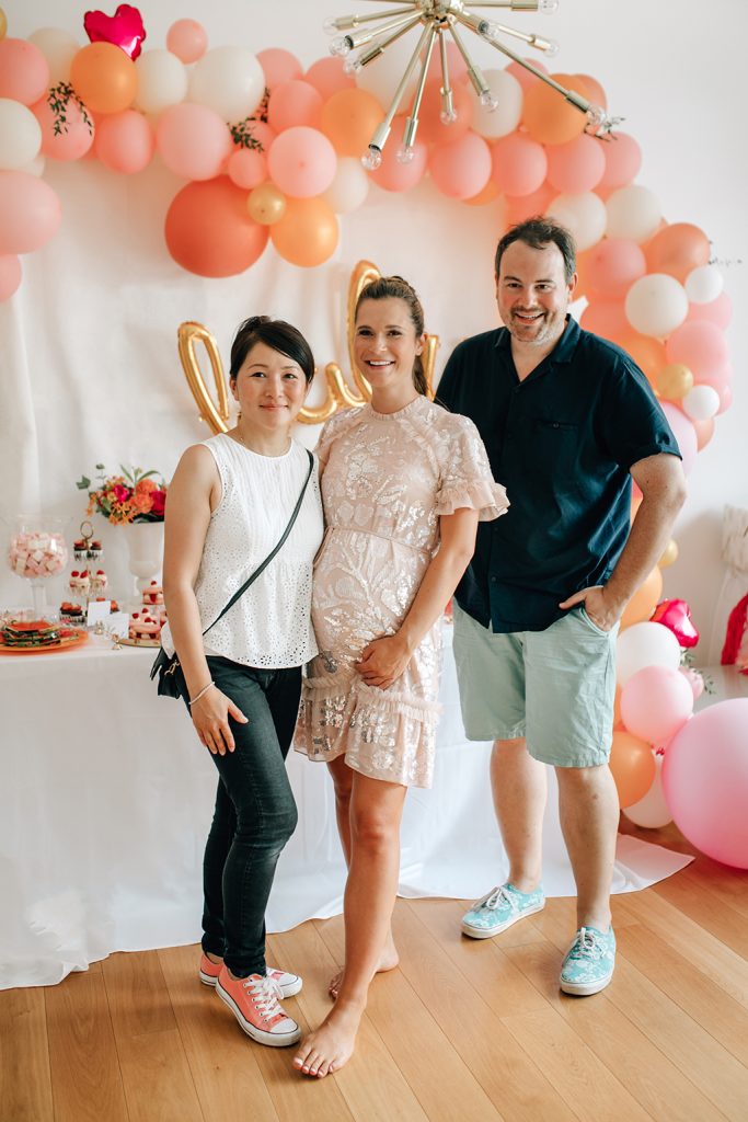 Julia & Christian wünschten sich eine Baby Shower in Sorbetfarben – also Pfirsich- und Rosatöne, etwas Pink und Orange als Akzente. Zentrale Deko sollte ein Sweet Table mit allerlei süßen Köstlichkeiten sein. Gesagt, getan! An einem Samstag im Juli haben wir dann alles vorbereitet – weiße Bentwood Chairs wurden geliefert, Torte & Sweets (Cup Cakes, Éclairs, Tarteletts, Macarons) abgeholt, Luftballons und Girlanden aufgehängt und eine Limonadenbar aufgebaut. Um den Sweet Table so richtig zur Geltung zu bringen, haben wir vor Ort eine moderne Ballongirlande als “Rahmen” installiert. Als die Freundinnen dann am Nachmittag eintrafen, wurde erstmal mit Sekt (für die Braut natürlich ohne Alkohol) angestoßen und viele Fotos gemacht… Die Mädels und Mamas hatten einen unvergesslichen Nachmittag mit Spielen, Torte, Limo und Sekt…