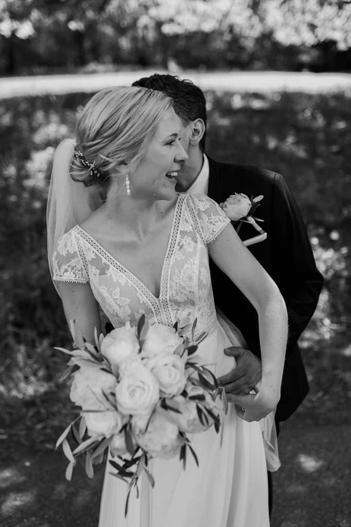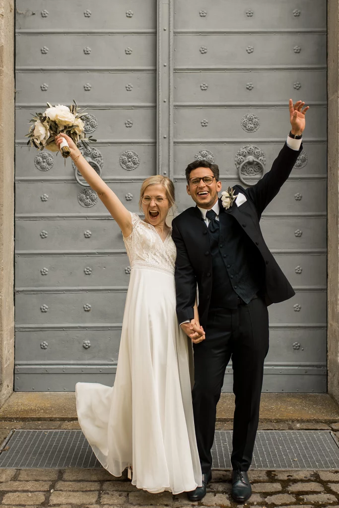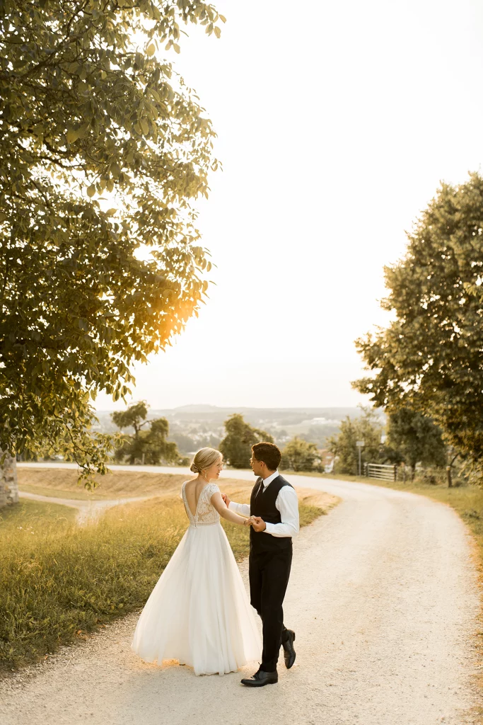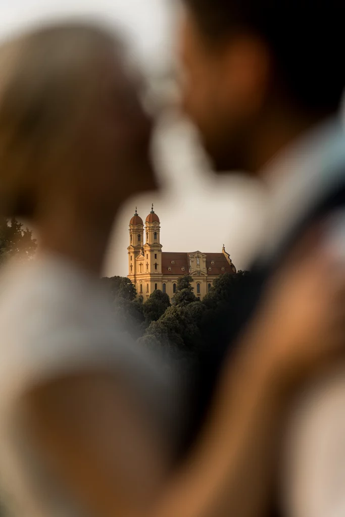 Genau so eine Trauung war diese von Franzi & Max an einem Samstag im Juni. Die katholische Zeremonie fand in der imposanten und hoch am Berg gelegenen Wallfahrtskirche Schönenberg statt, die wahrlich eine beeindruckende Kulisse für den besonderen Tag bot. Ein extra aus München angereister 50-köpfiger Chor untermalte die Trauung mit wunderbarem Gesang und erzeugte bei vielen Gästen und mir Gänsehaut. Die Atmosphäre war wirklich einmalig und sehr festlich.