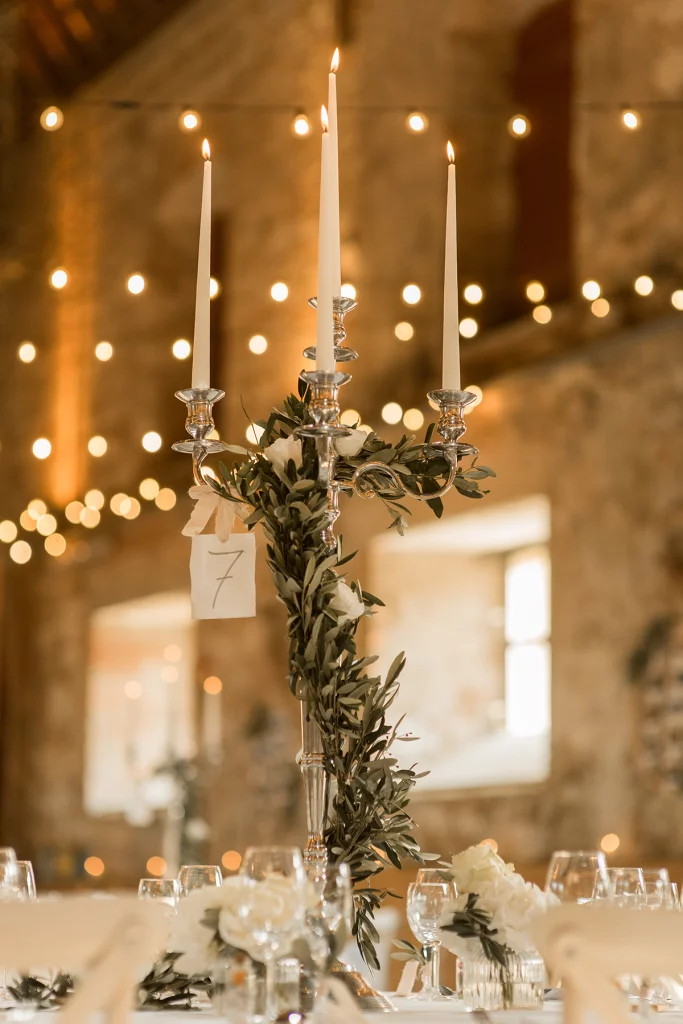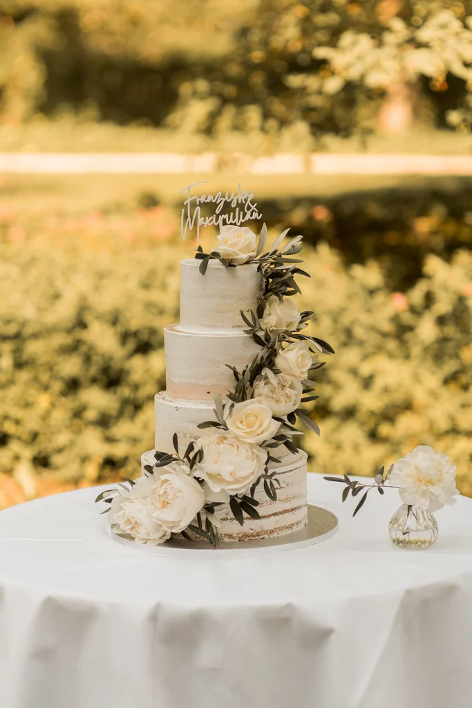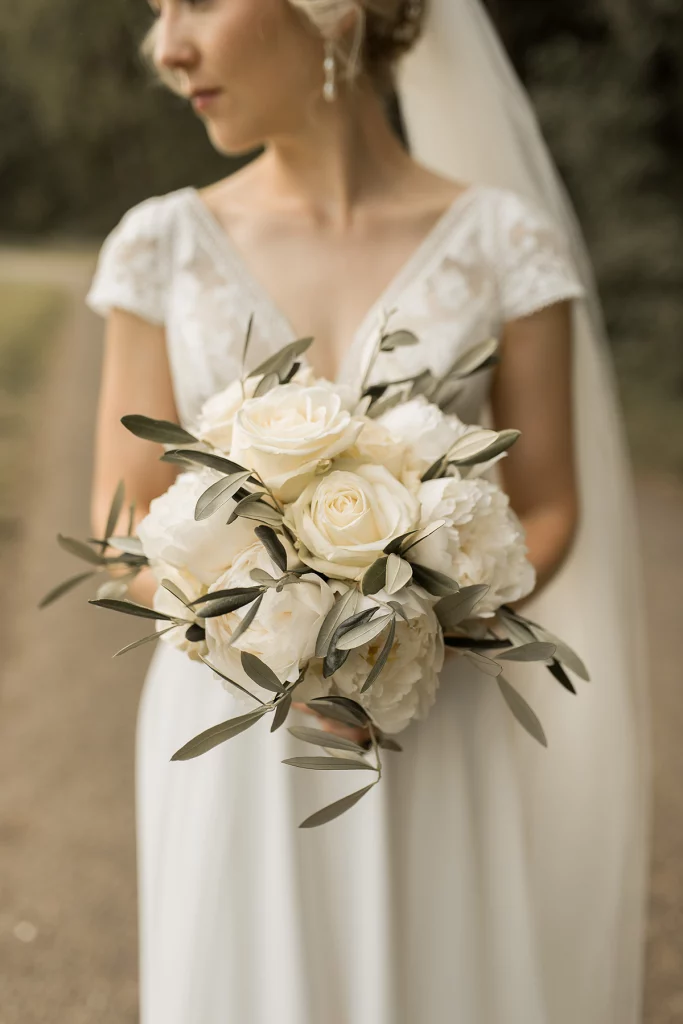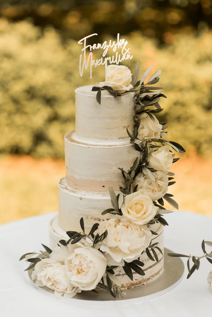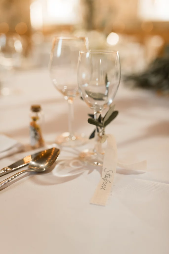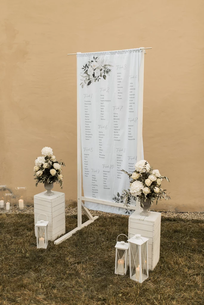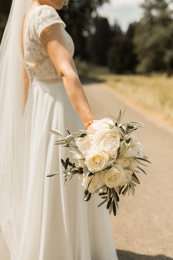Die Feier nach der Zeremonie fand in der Stallung im Schloss ob Ellwangen statt. Die rustikale Atmosphäre der Stallung gab der Feier eine charmante Note. Die Blumen-Dekoration war im mediterranen Greenery-Stil gehalten, mit viel Olive und weißen Hortensien und Rosen, die eine elegante und dennoch natürliche Atmosphäre schuf. Die Kombination von Olivenzweigen und weißen Blumen verlieh dem gesamten Ambiente eine zeitlose Eleganz.