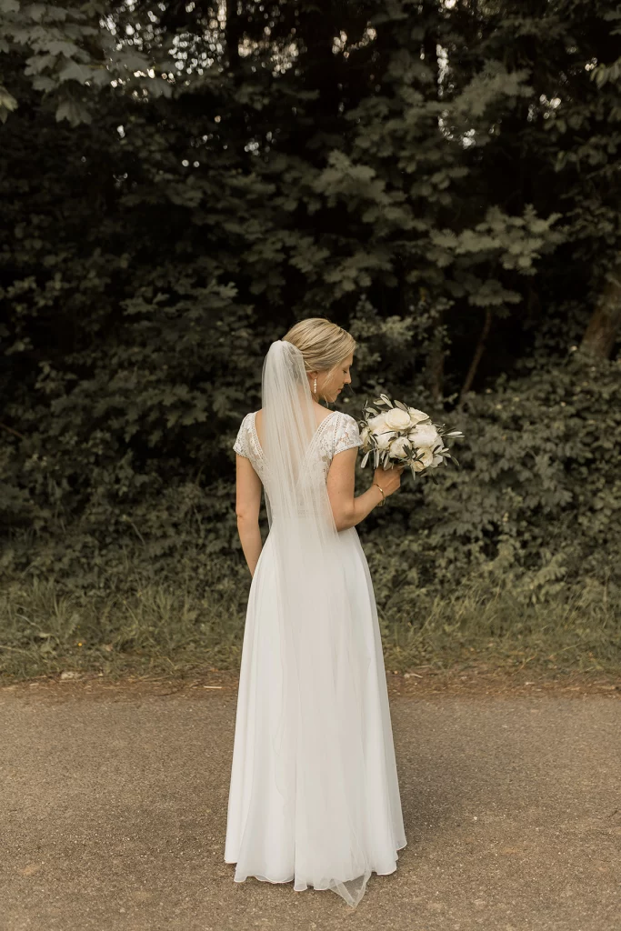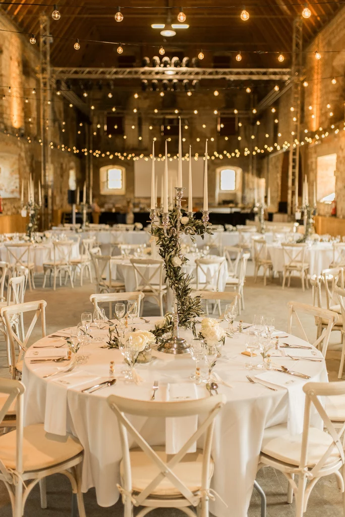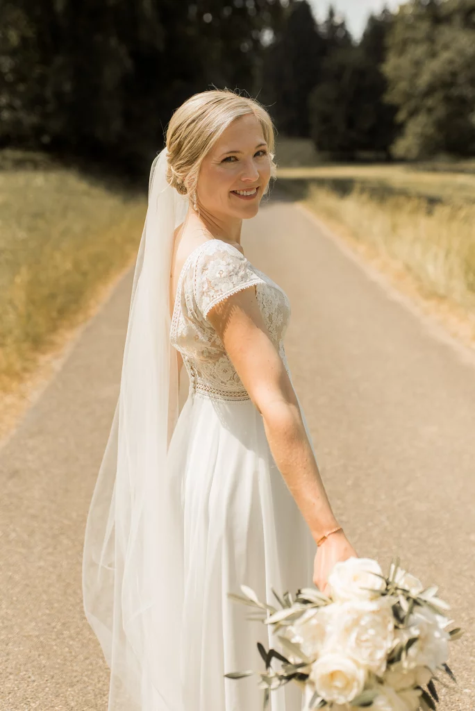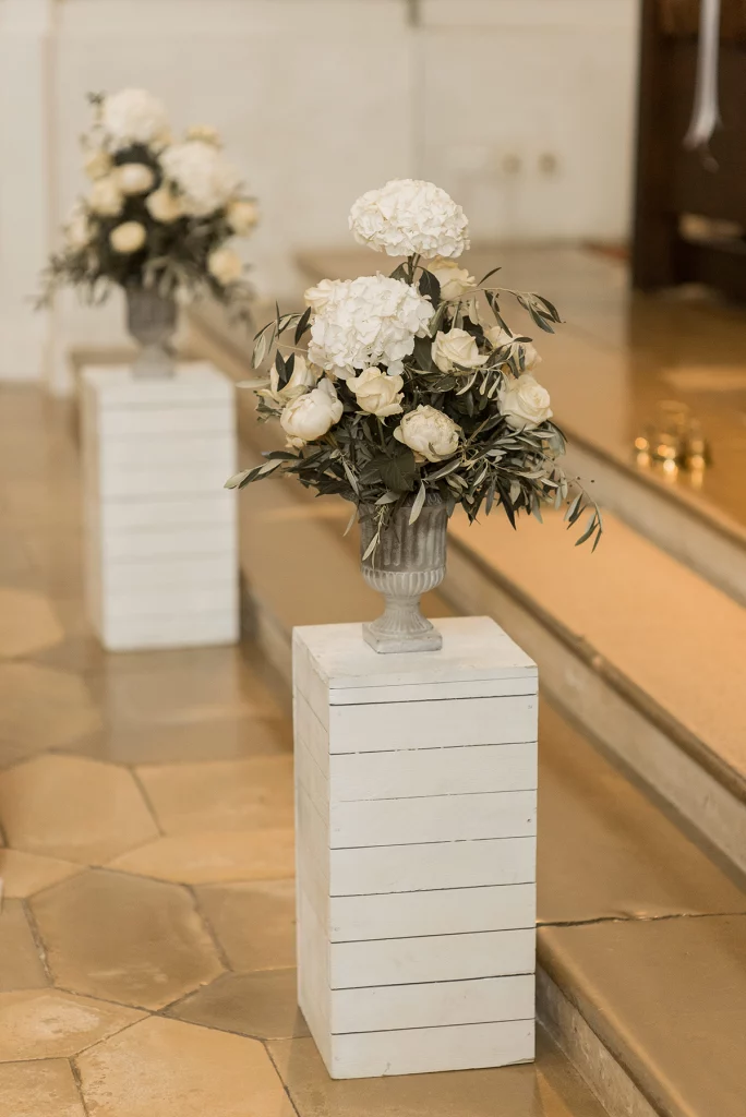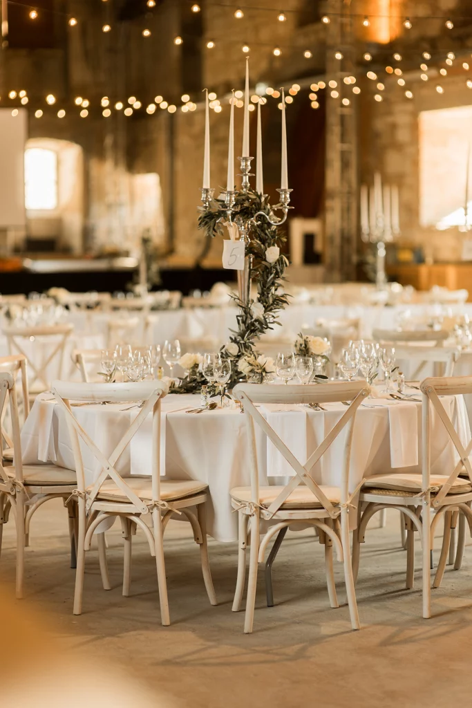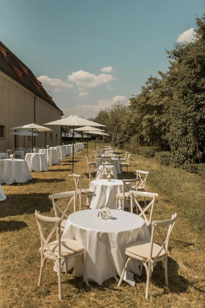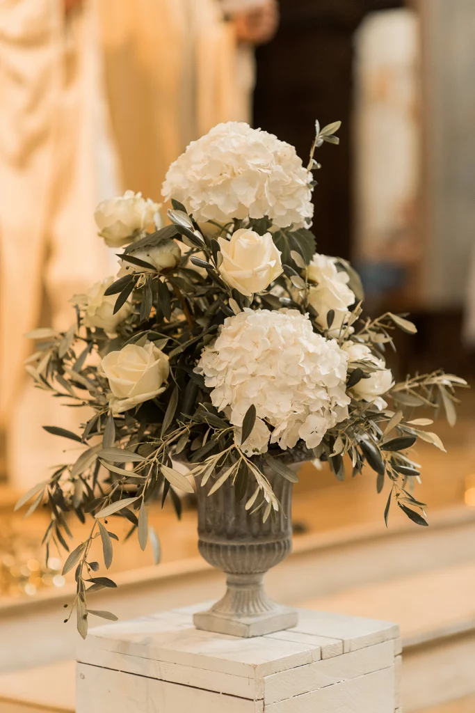 Die Feier nach der Zeremonie fand in der Stallung im Schloss ob Ellwangen statt. Die rustikale Atmosphäre der Stallung gab der Feier eine charmante Note. Die Blumen-Dekoration war im mediterranen Greenery-Stil gehalten, mit viel Olive und weißen Hortensien und Rosen, die eine elegante und dennoch natürliche Atmosphäre schuf. Die Kombination von Olivenzweigen und weißen Blumen verlieh dem gesamten Ambiente eine zeitlose Eleganz.