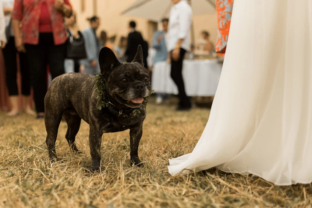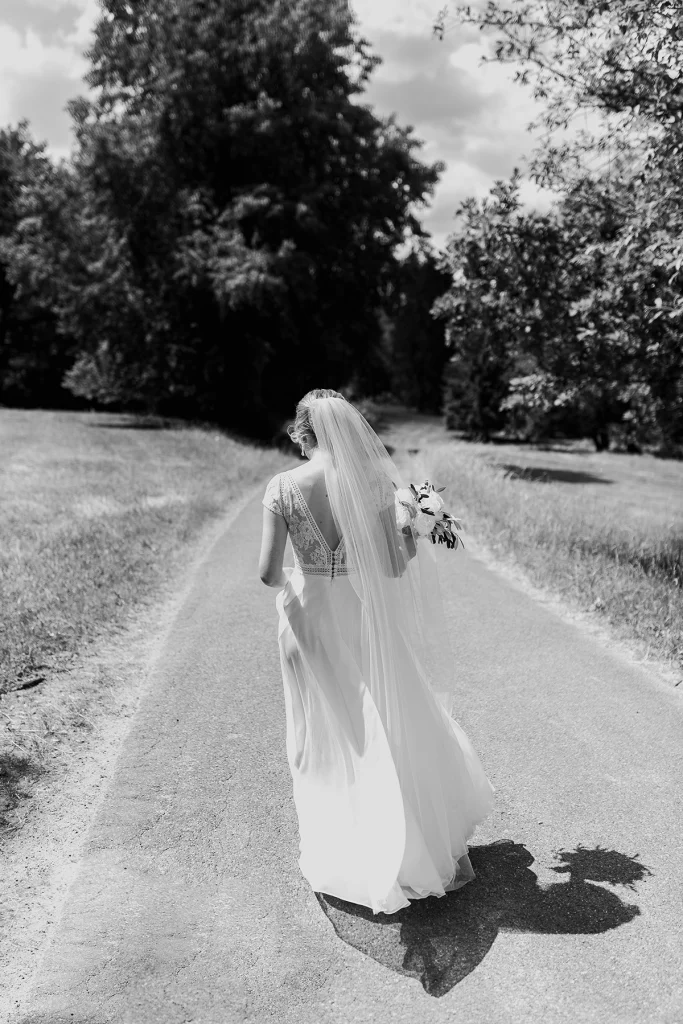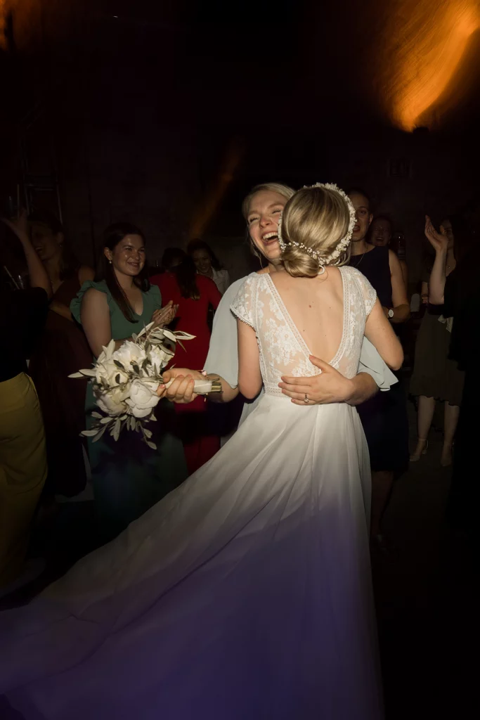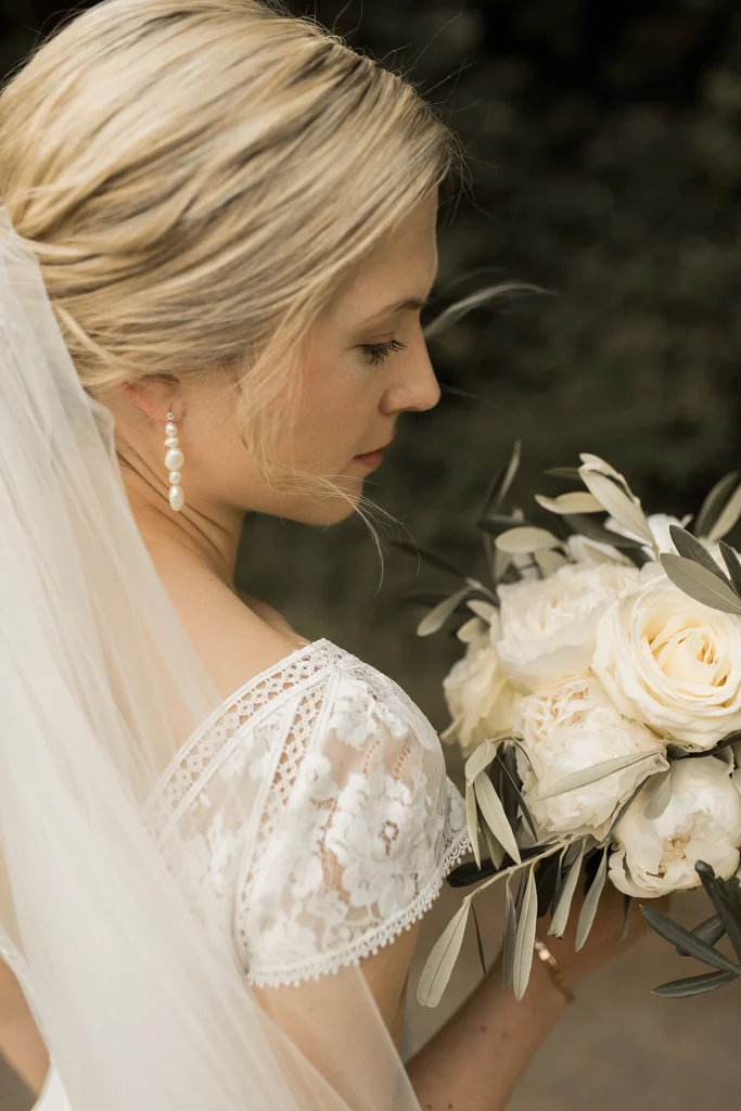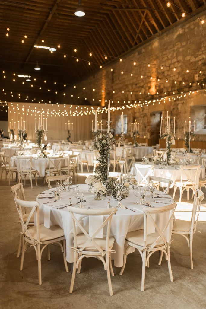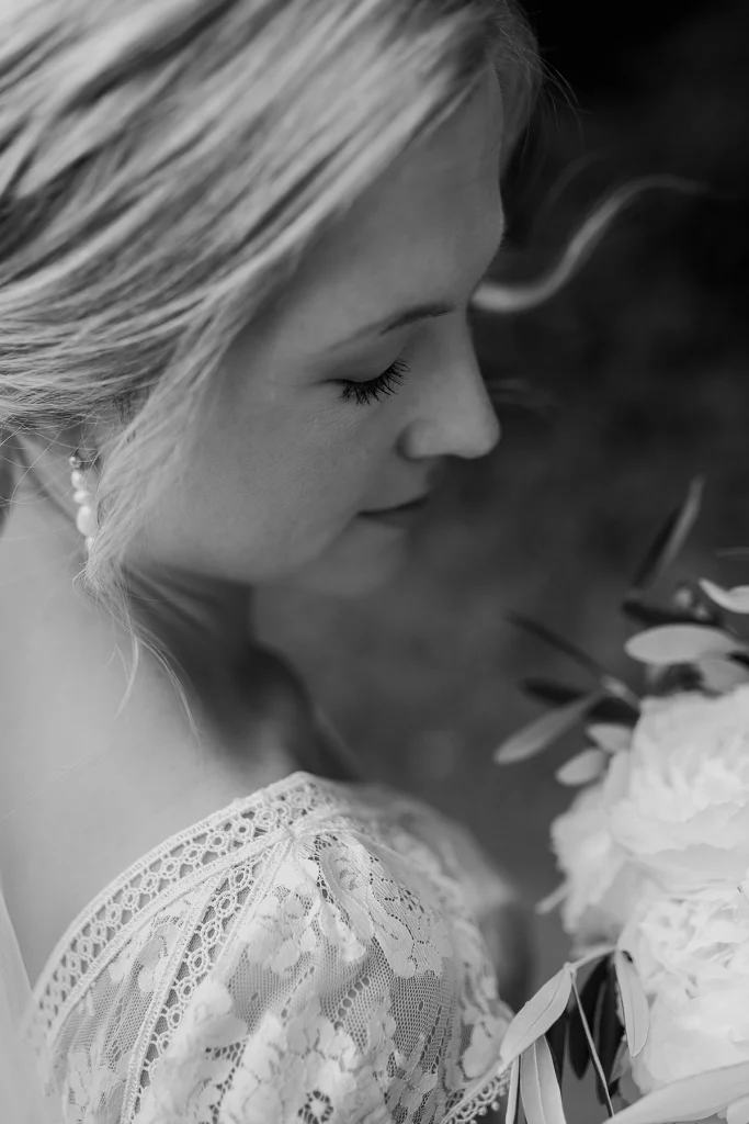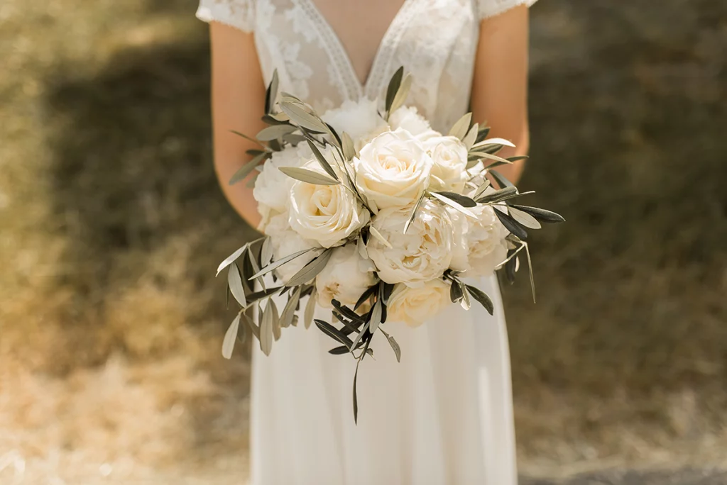 Die Feier nach der Zeremonie fand in der Stallung im Schloss ob Ellwangen statt. Die rustikale Atmosphäre der Stallung gab der Feier eine charmante Note. Die Blumen-Dekoration war im mediterranen Greenery-Stil gehalten, mit viel Olive und weißen Hortensien und Rosen, die eine elegante und dennoch natürliche Atmosphäre schuf. Die Kombination von Olivenzweigen und weißen Blumen verlieh dem gesamten Ambiente eine zeitlose Eleganz.