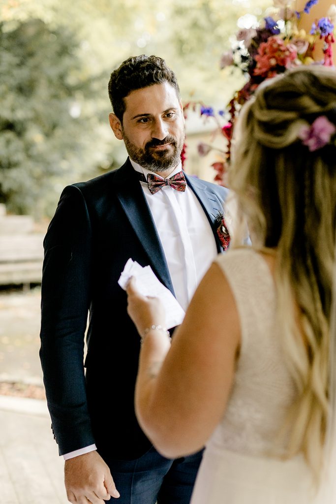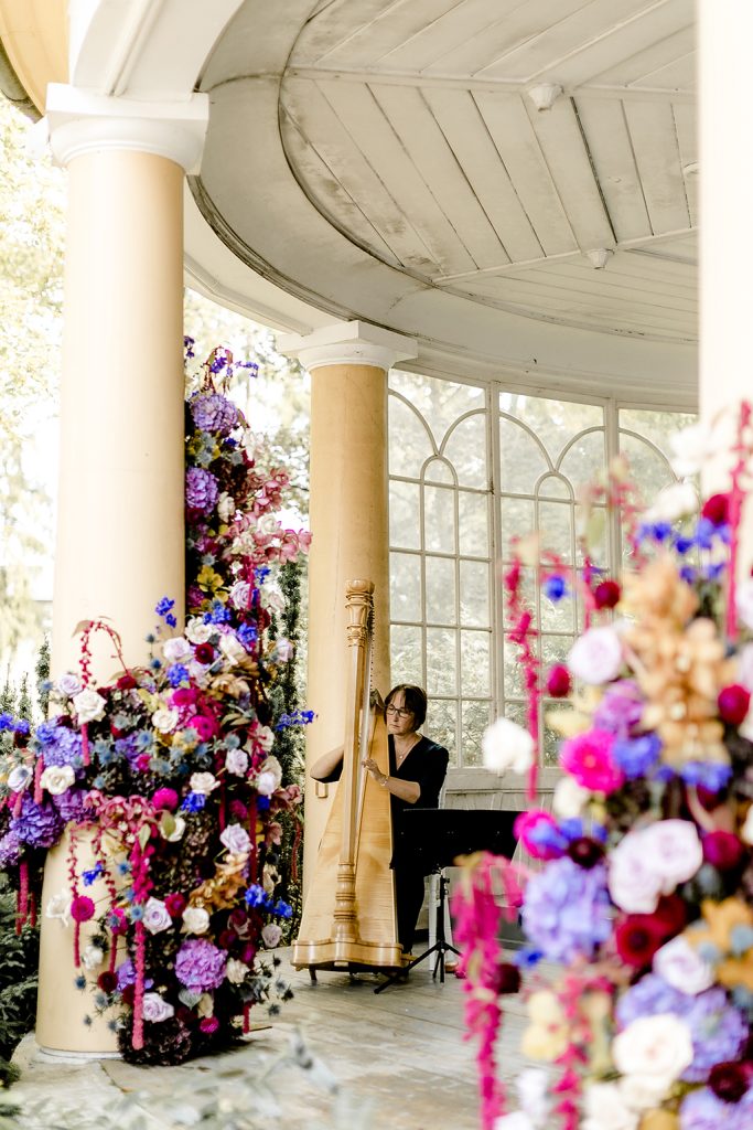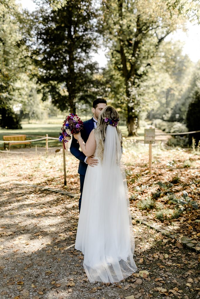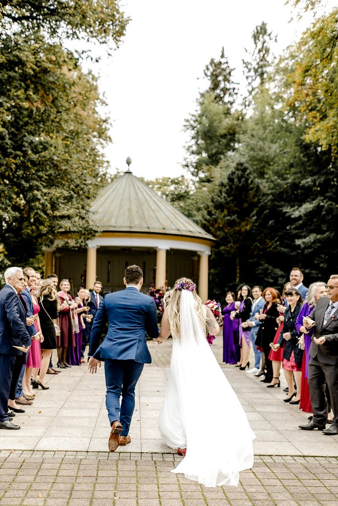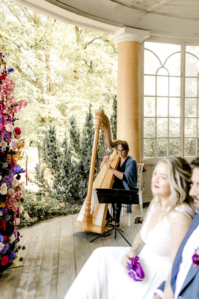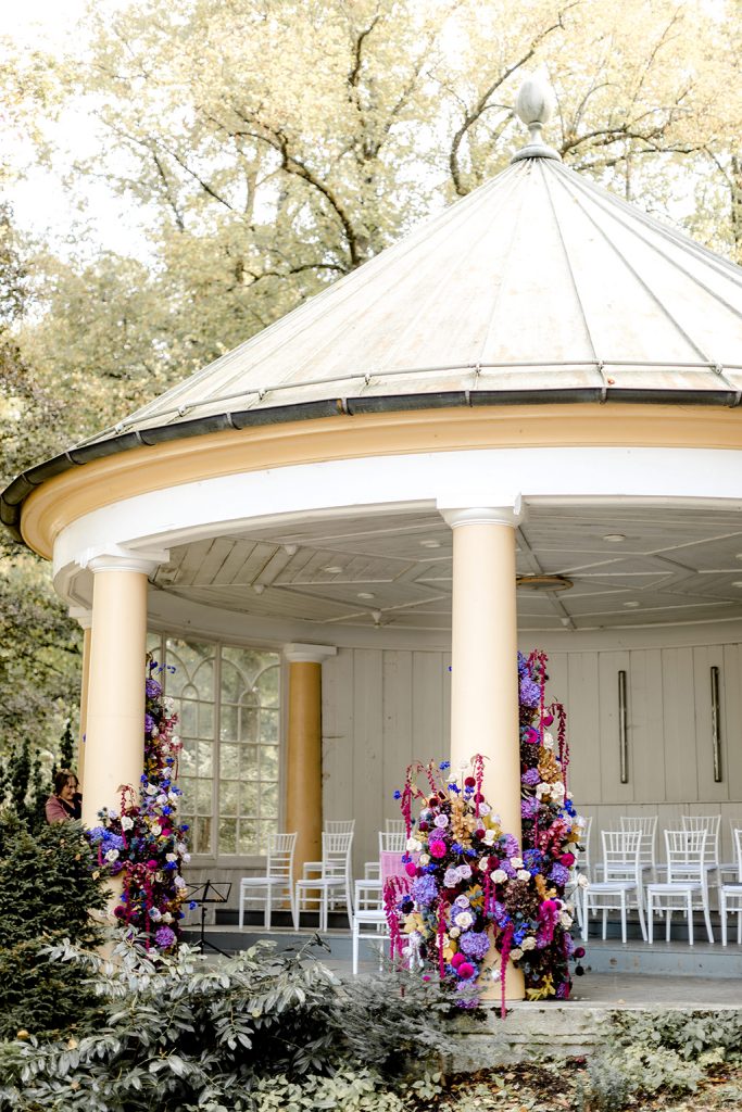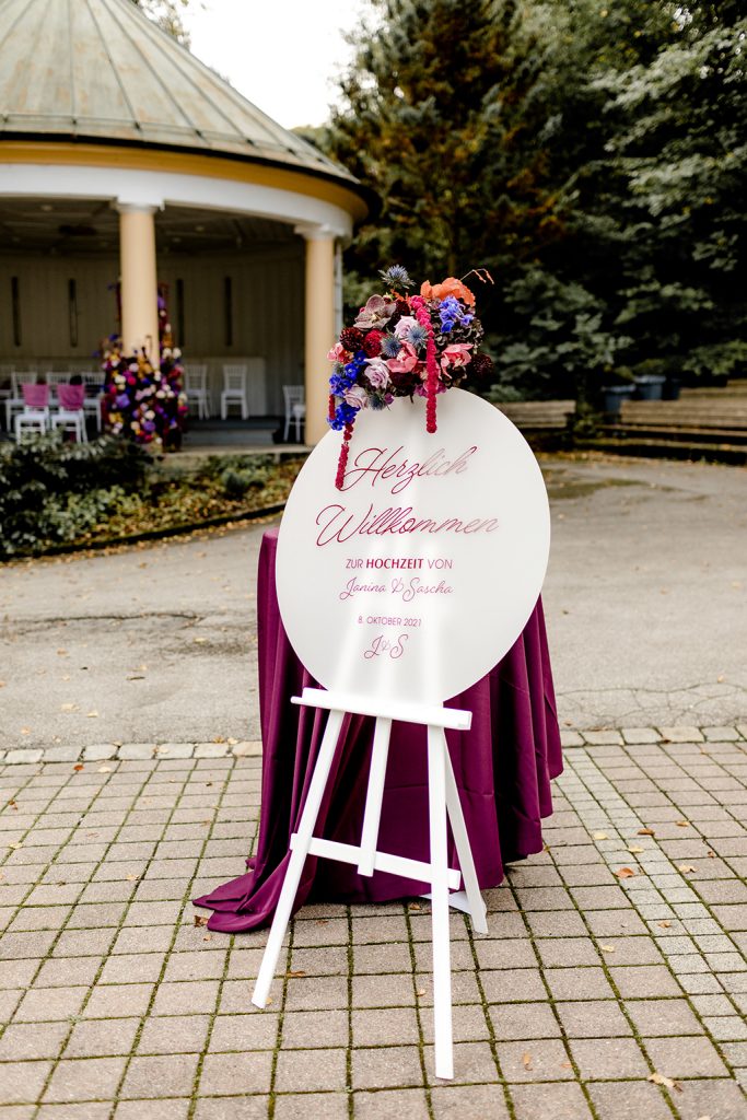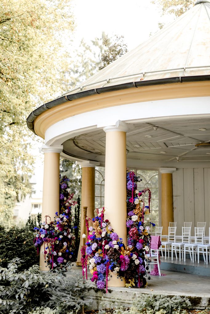 Schon beim ersten Besuch der Location war klar, dass die Trauung im Musikpavillon im Kurpark stattfinden sollte. Passend dazu spielte eine Harfenistin während der Zeremonie vier berührende Lieder – spätestens seit Ellie Gouldings „How long will you love me“ flossen die ersten Tränen. Das florale Design sollte opulent, glamourös, farbenfroh und elegant sein. Das Blumenfenster Dachau hat diesen Wunsch perfekt umgesetzt. Die Säulen des Pavillons waren wunderschön floral geschmückt – dieses „Bild“ hatte ich sofort vor Augen, als ich den Ort zum ersten Mal sah – und fungierten so als „Kulisse“ für die freie Trauung.
