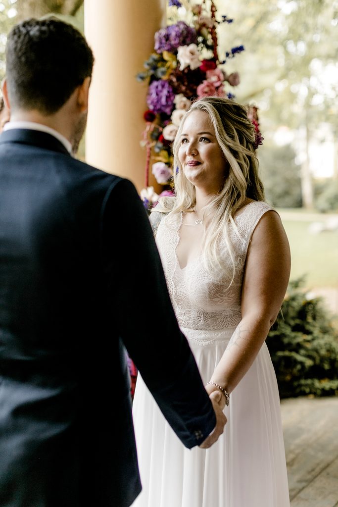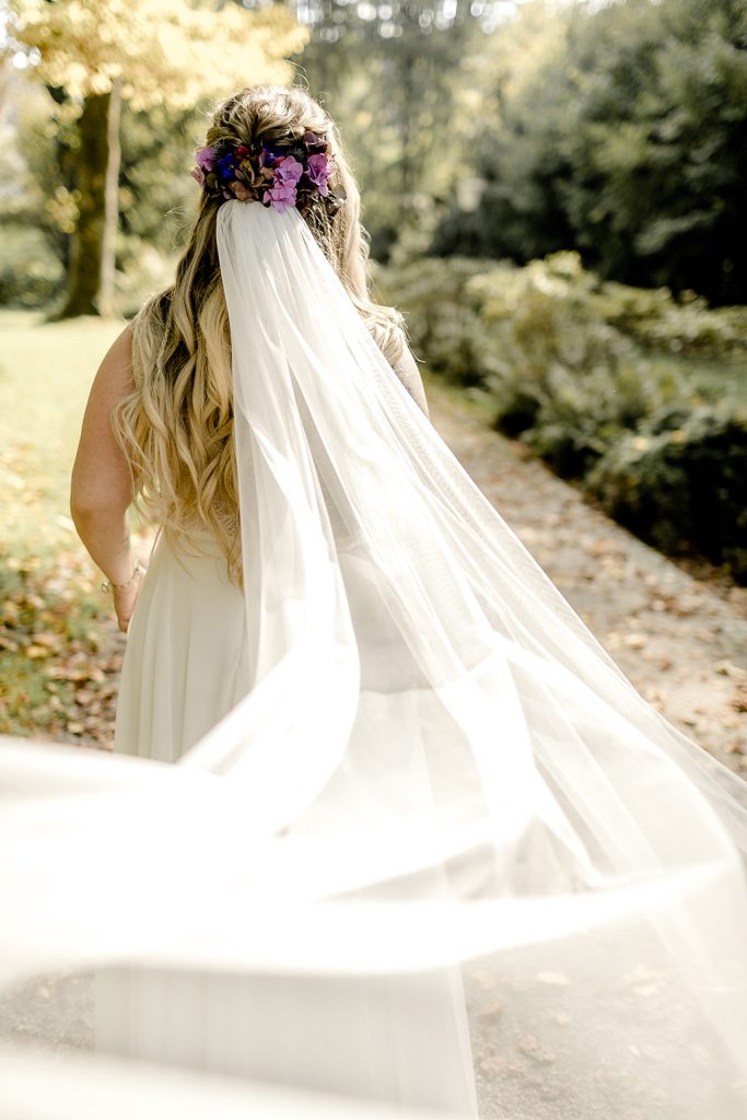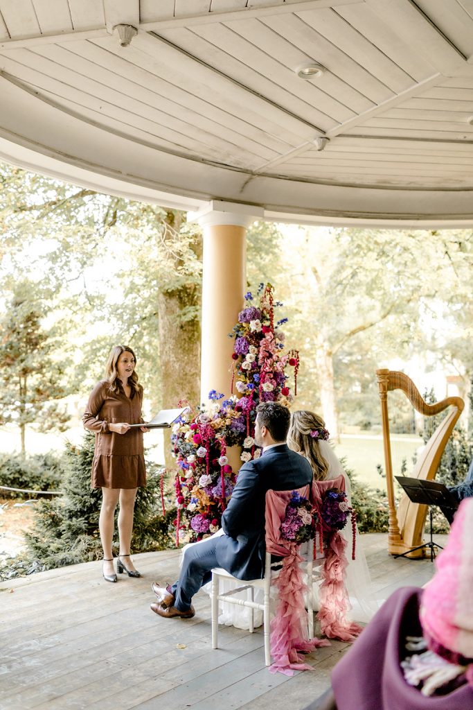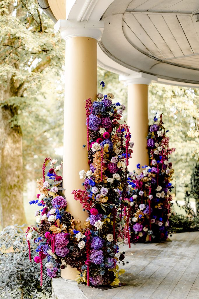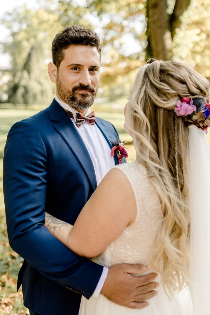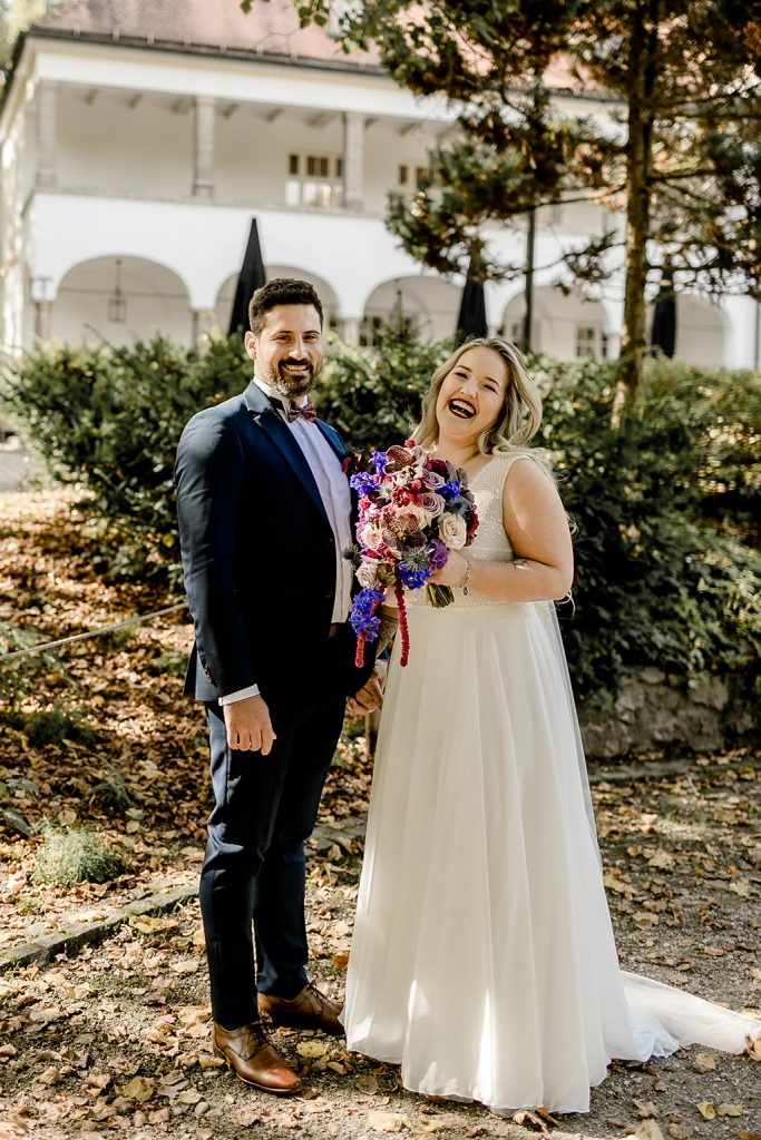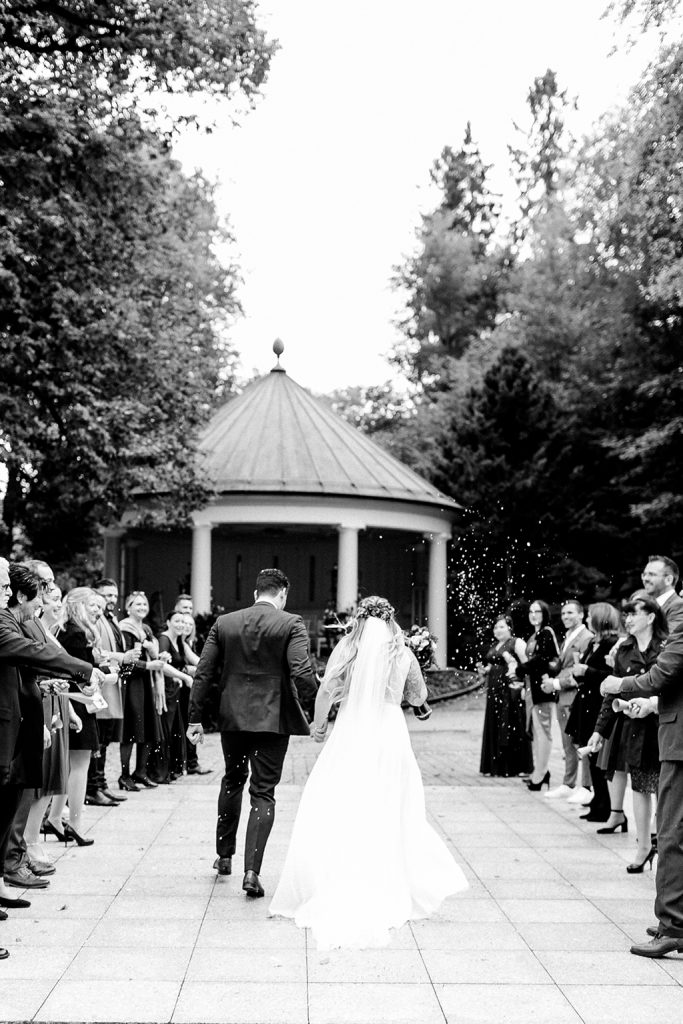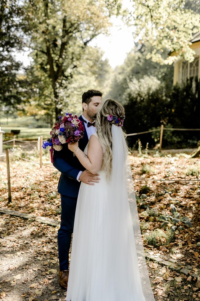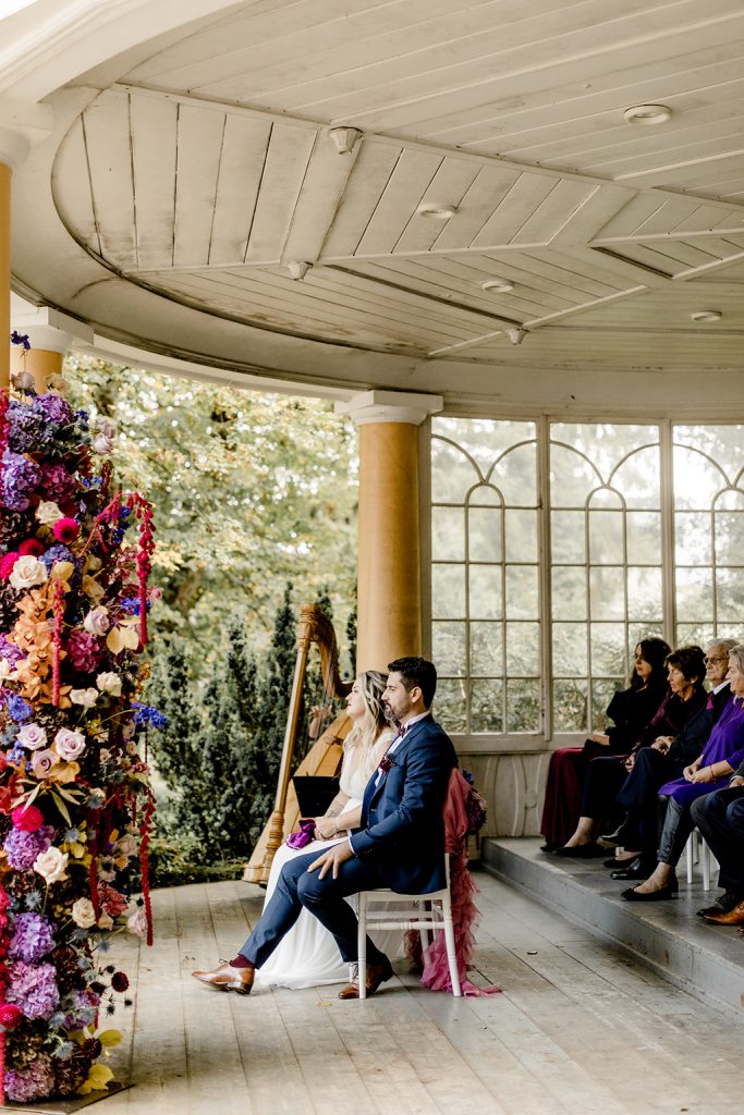 Schon beim ersten Besuch der Location war klar, dass die Trauung im Musikpavillon im Kurpark stattfinden sollte. Passend dazu spielte eine Harfenistin während der Zeremonie vier berührende Lieder – spätestens seit Ellie Gouldings „How long will you love me“ flossen die ersten Tränen. Das florale Design sollte opulent, glamourös, farbenfroh und elegant sein. Das Blumenfenster Dachau hat diesen Wunsch perfekt umgesetzt. Die Säulen des Pavillons waren wunderschön floral geschmückt – dieses „Bild“ hatte ich sofort vor Augen, als ich den Ort zum ersten Mal sah – und fungierten so als „Kulisse“ für die freie Trauung.