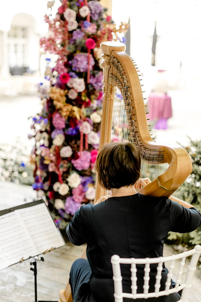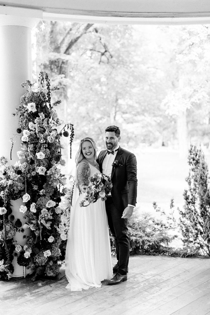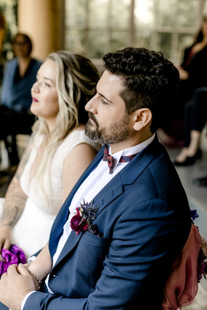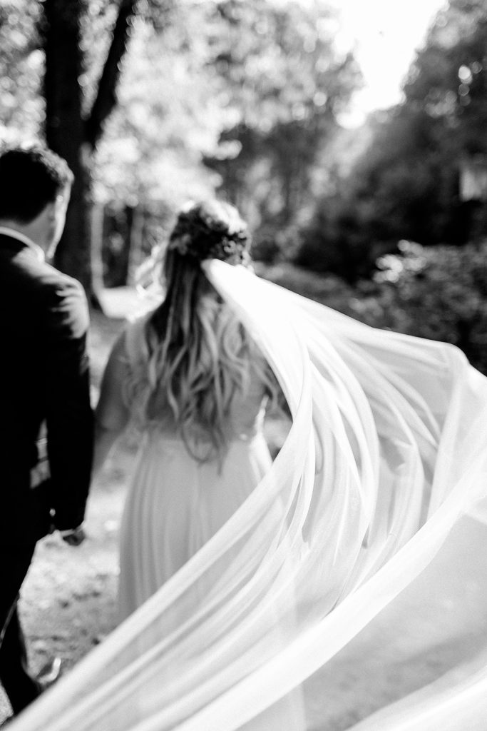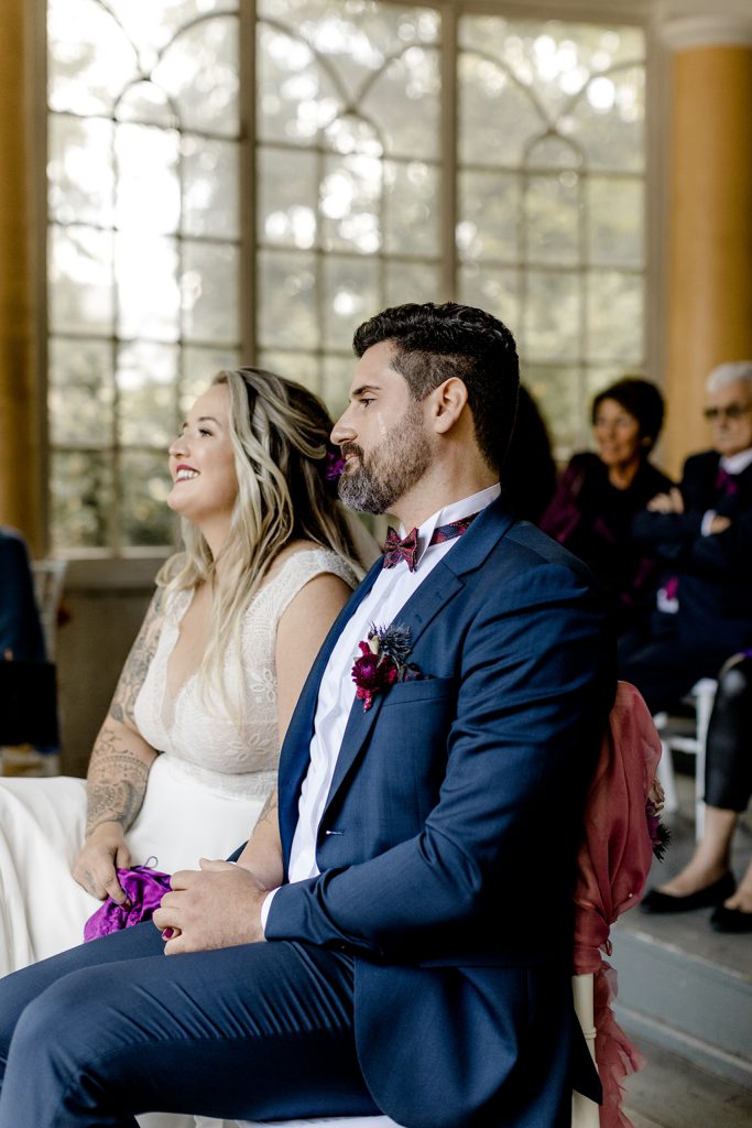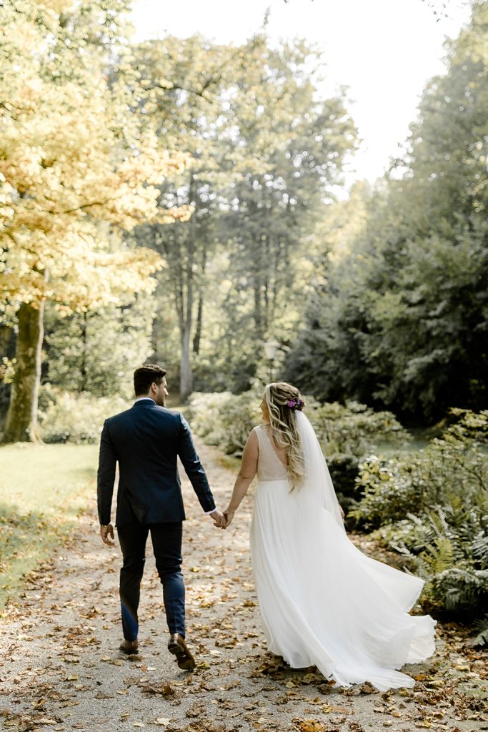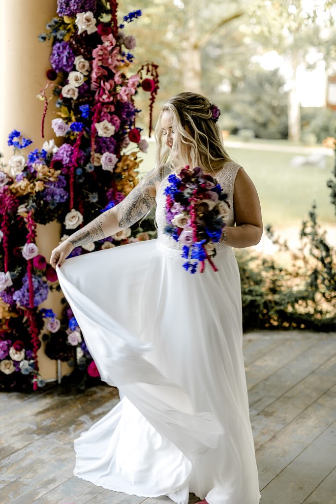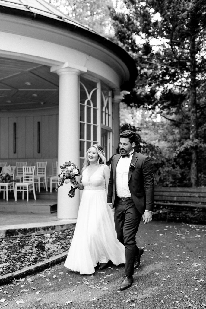 Schon beim ersten Besuch der Location war klar, dass die Trauung im Musikpavillon im Kurpark stattfinden sollte. Passend dazu spielte eine Harfenistin während der Zeremonie vier berührende Lieder – spätestens seit Ellie Gouldings „How long will you love me“ flossen die ersten Tränen. Das florale Design sollte opulent, glamourös, farbenfroh und elegant sein. Das Blumenfenster Dachau hat diesen Wunsch perfekt umgesetzt. Die Säulen des Pavillons waren wunderschön floral geschmückt – dieses „Bild“ hatte ich sofort vor Augen, als ich den Ort zum ersten Mal sah – und fungierten so als „Kulisse“ für die freie Trauung.