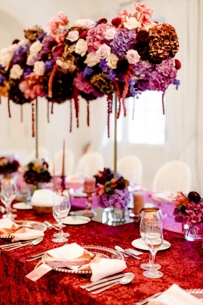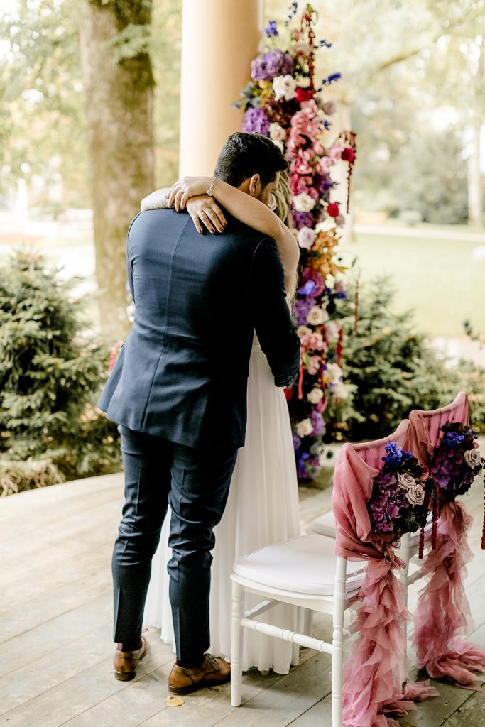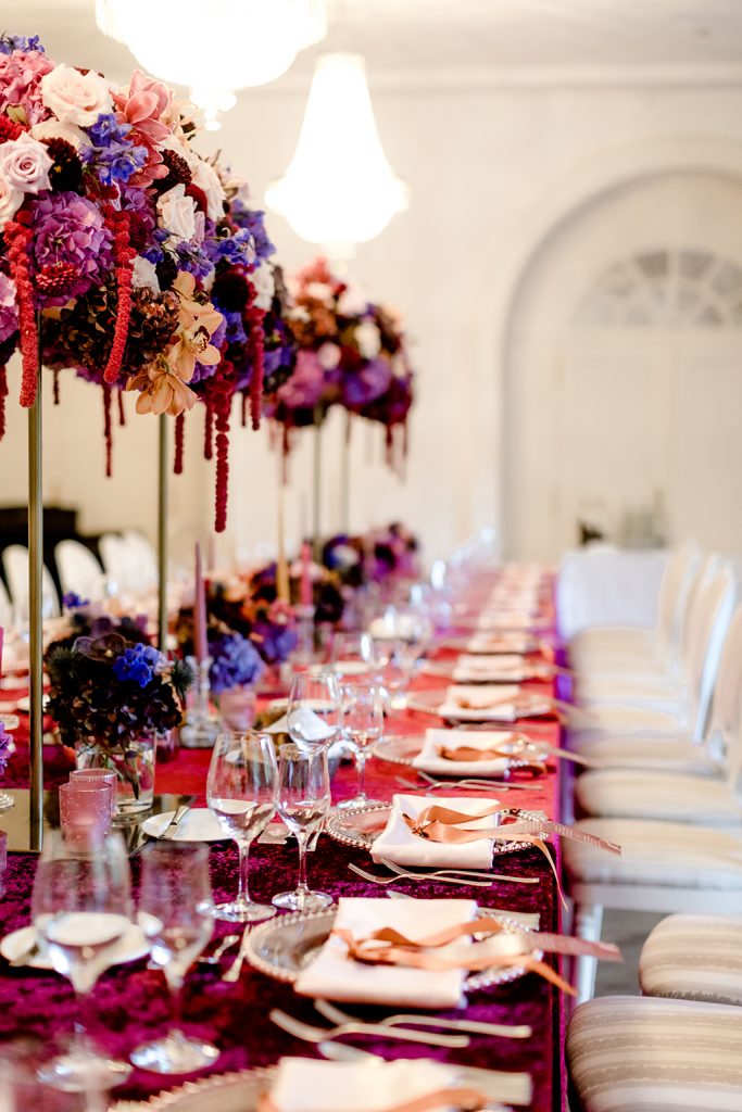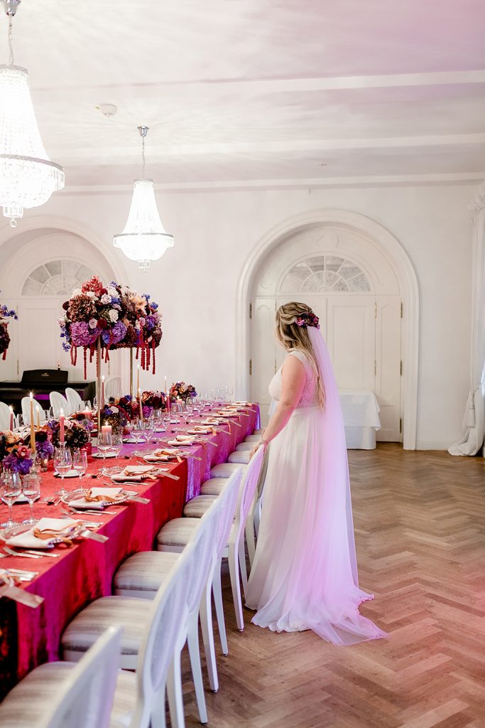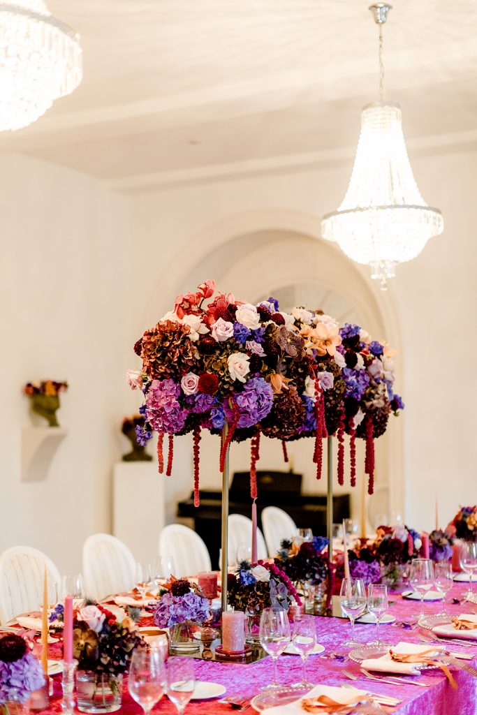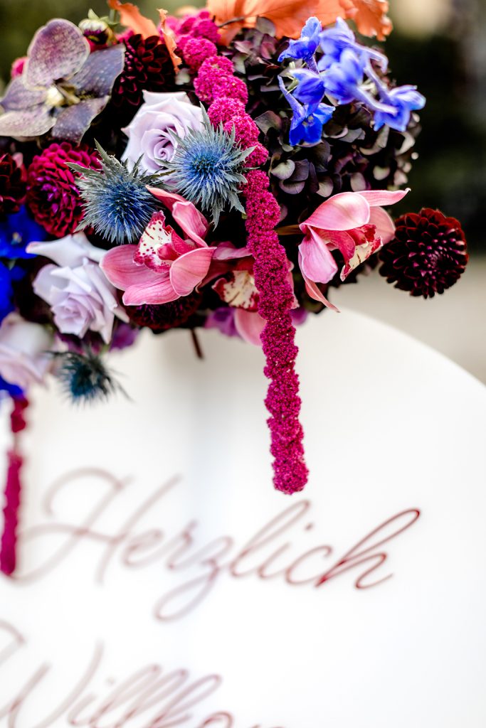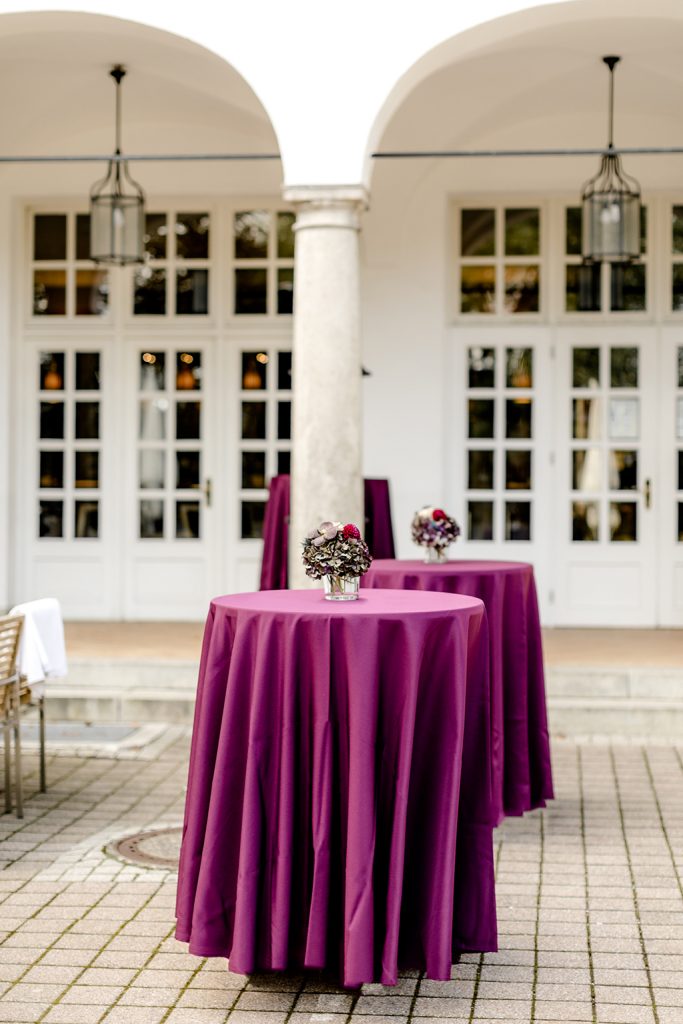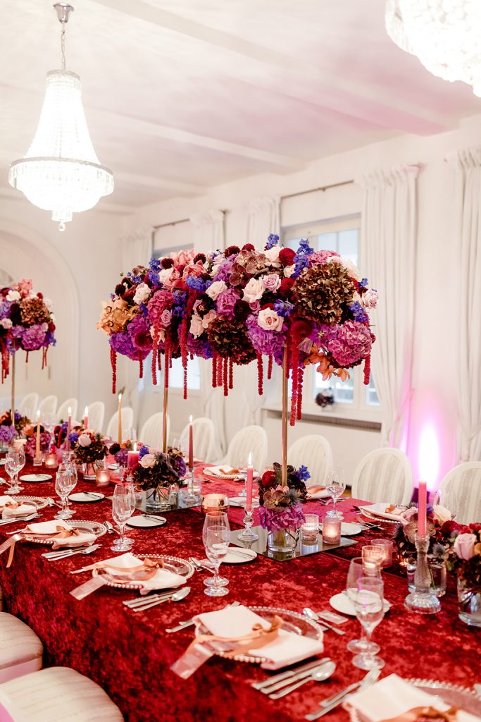 Nachdem die Location gefunden war, erstellte ich ein Konzept für die beiden, das ihren Wunsch nach einer herbstlichen und farbenfrohen Gestaltung, nach opulentem Glamour und kurzweiliger Unterhaltung zum Ausdruck brachte. Wir entschieden uns für eine Palette aus Beerenfarben für diese Herbsthochzeit. Um die Unterhaltung kümmerte sich am Nachmittag ein Schnellzeichner, der alle Gäste porträtierte (das Portrait war auch ein perfektes Gastgeschenk), ein Mentalist, der nach dem Hauptgang in einer 30-minütigen Show alle Gäste zum Staunen und Lachen brachte, und ein Saxophonist, der sogar auf dem Tisch spielte und tanzte und zusammen mit dem DJ das Publikum zum Kochen brachte. Ich habe noch nie eine Hochzeit mit relativ wenigen Gästen erlebt, bei der die Tanzfläche den ganzen Abend über so voll war.