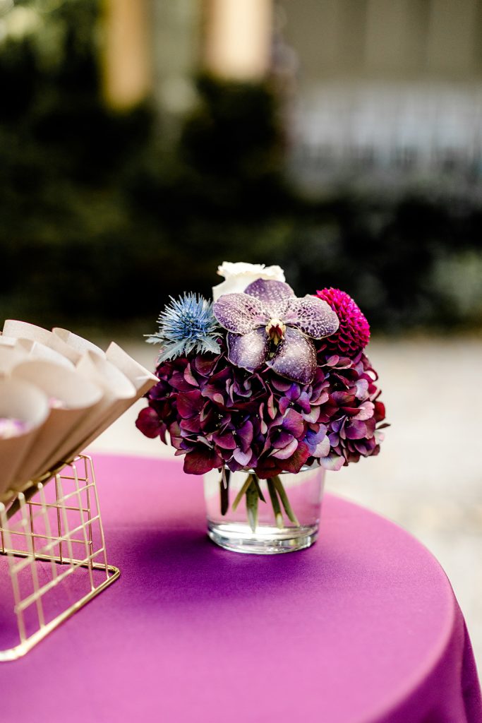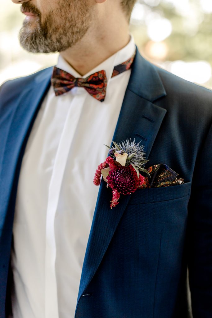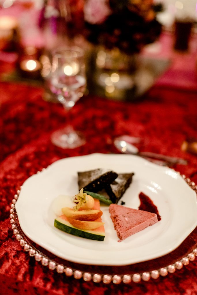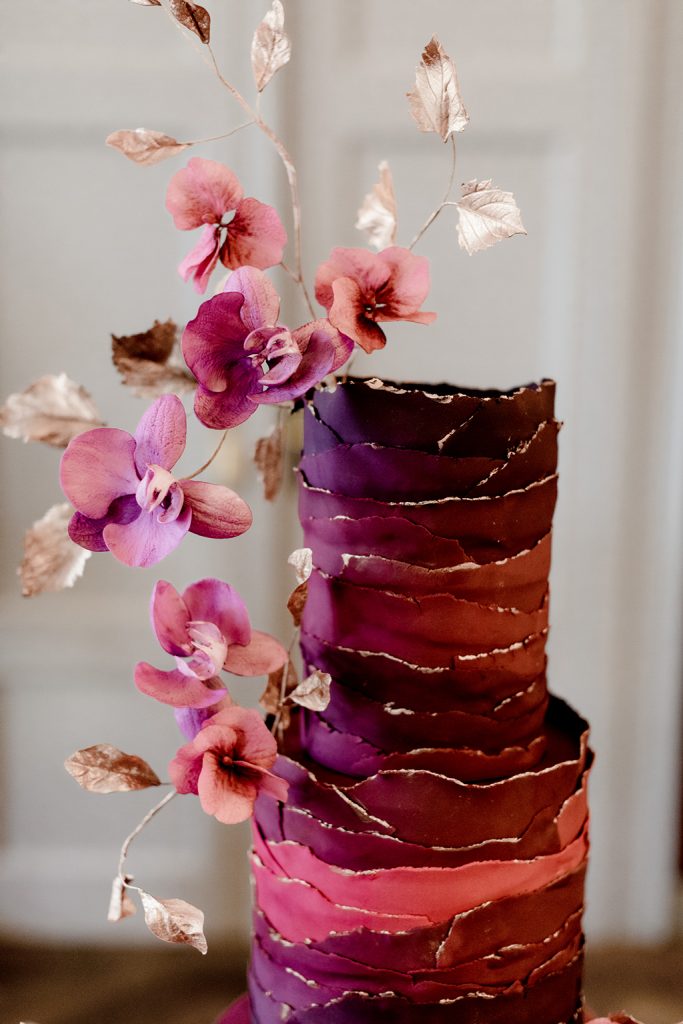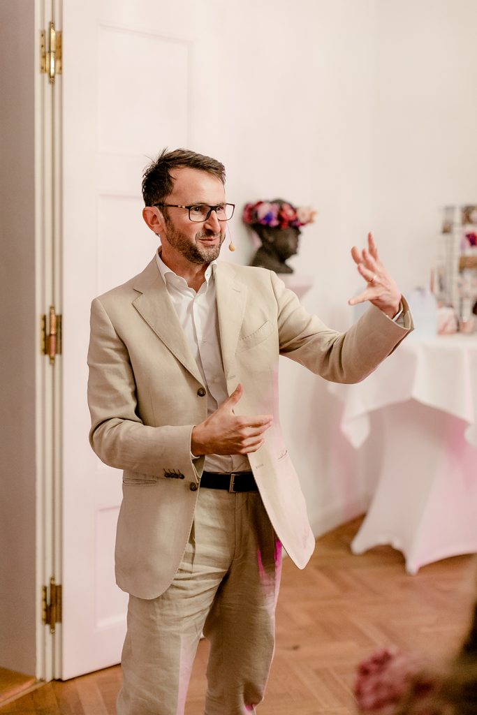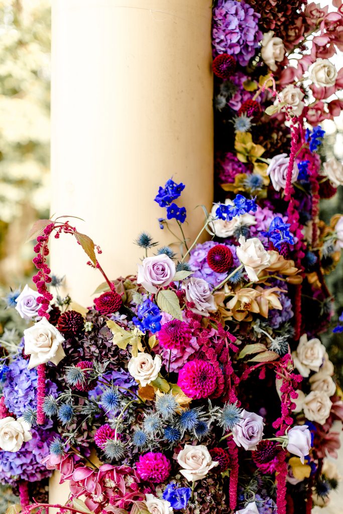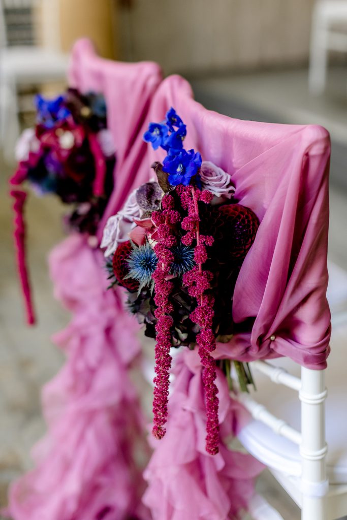 Nachdem die Location gefunden war, erstellte ich ein Konzept für die beiden, das ihren Wunsch nach einer herbstlichen und farbenfrohen Gestaltung, nach opulentem Glamour und kurzweiliger Unterhaltung zum Ausdruck brachte. Wir entschieden uns für eine Palette aus Beerenfarben für diese Herbsthochzeit. Um die Unterhaltung kümmerte sich am Nachmittag ein Schnellzeichner, der alle Gäste porträtierte (das Portrait war auch ein perfektes Gastgeschenk), ein Mentalist, der nach dem Hauptgang in einer 30-minütigen Show alle Gäste zum Staunen und Lachen brachte, und ein Saxophonist, der sogar auf dem Tisch spielte und tanzte und zusammen mit dem DJ das Publikum zum Kochen brachte. Ich habe noch nie eine Hochzeit mit relativ wenigen Gästen erlebt, bei der die Tanzfläche den ganzen Abend über so voll war.