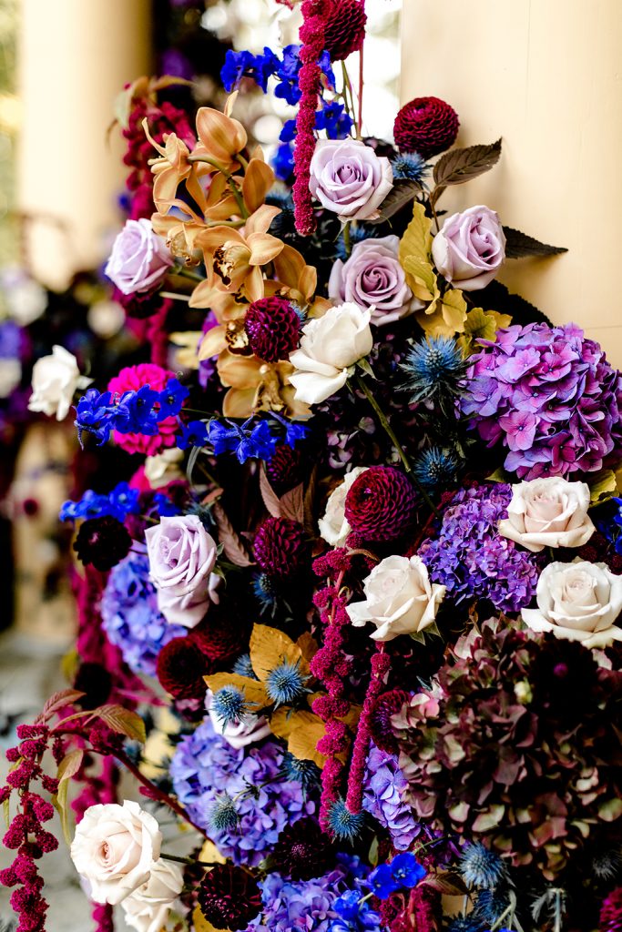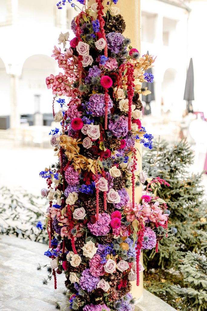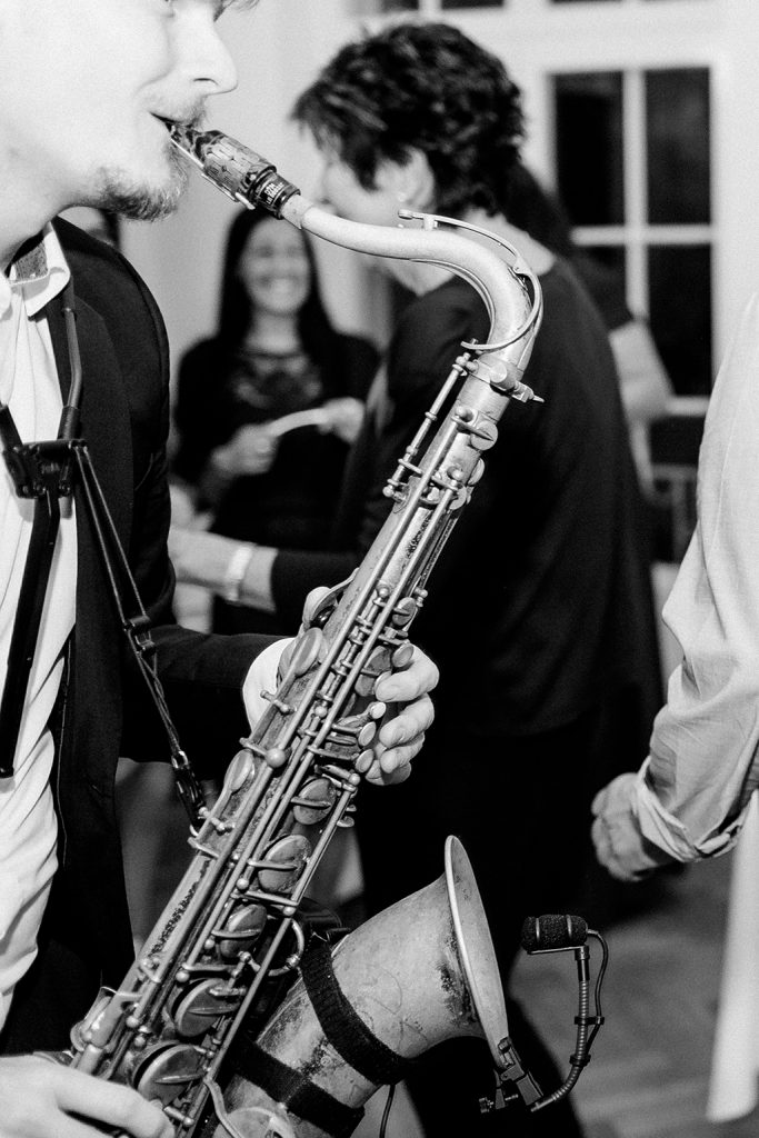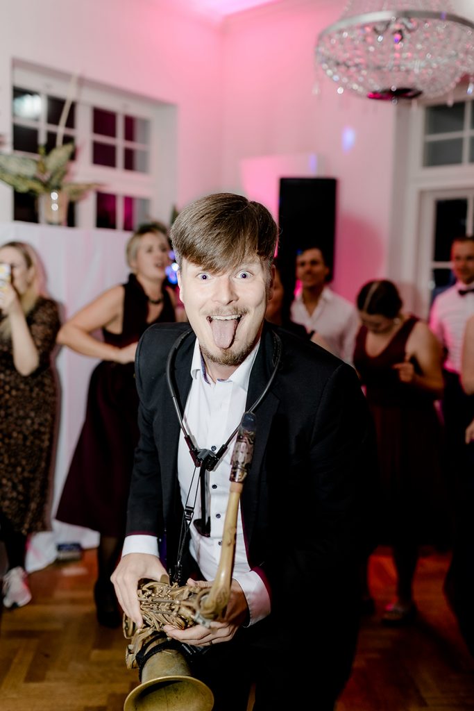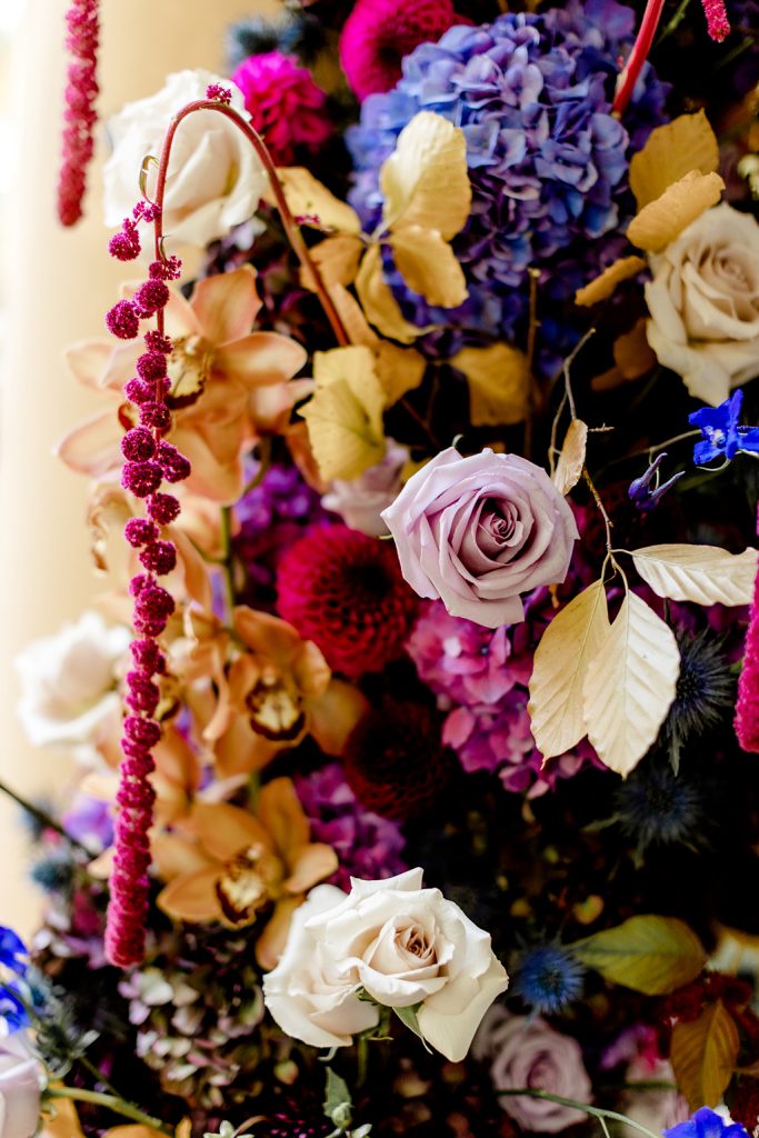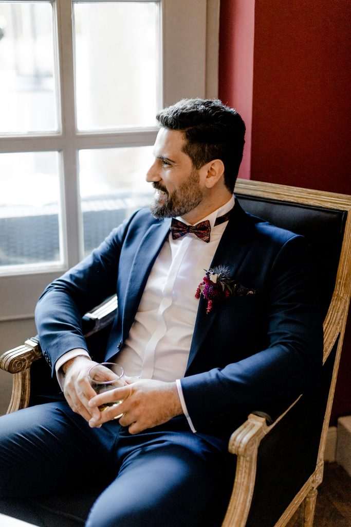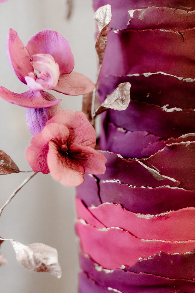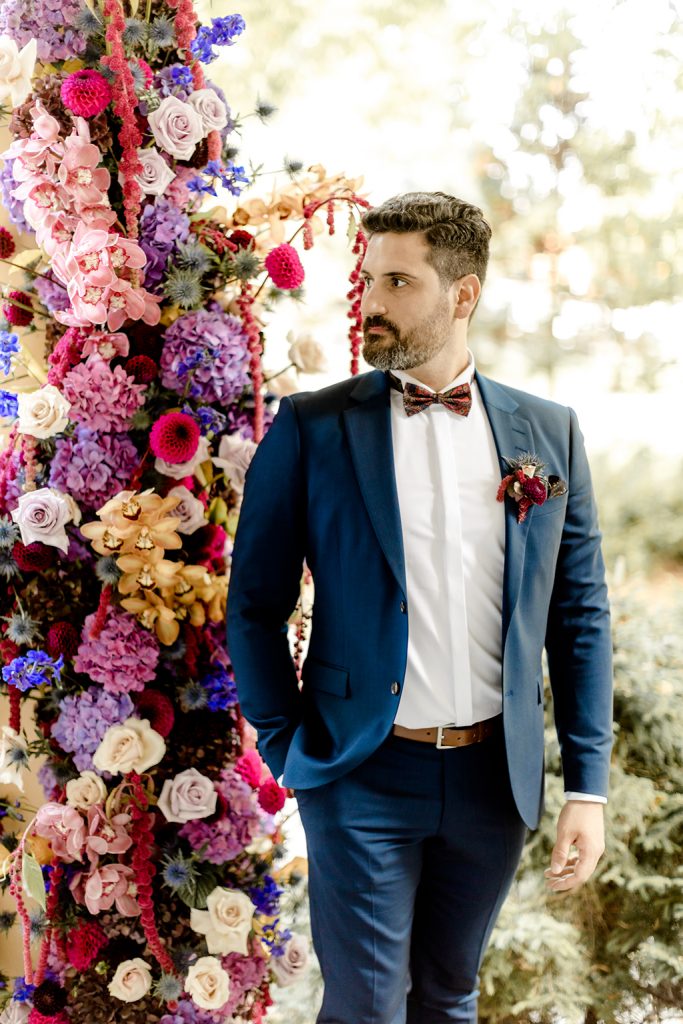 Nachdem die Location gefunden war, erstellte ich ein Konzept für die beiden, das ihren Wunsch nach einer herbstlichen und farbenfrohen Gestaltung, nach opulentem Glamour und kurzweiliger Unterhaltung zum Ausdruck brachte. Wir entschieden uns für eine Palette aus Beerenfarben für diese Herbsthochzeit. Um die Unterhaltung kümmerte sich am Nachmittag ein Schnellzeichner, der alle Gäste porträtierte (das Portrait war auch ein perfektes Gastgeschenk), ein Mentalist, der nach dem Hauptgang in einer 30-minütigen Show alle Gäste zum Staunen und Lachen brachte, und ein Saxophonist, der sogar auf dem Tisch spielte und tanzte und zusammen mit dem DJ das Publikum zum Kochen brachte. Ich habe noch nie eine Hochzeit mit relativ wenigen Gästen erlebt, bei der die Tanzfläche den ganzen Abend über so voll war.