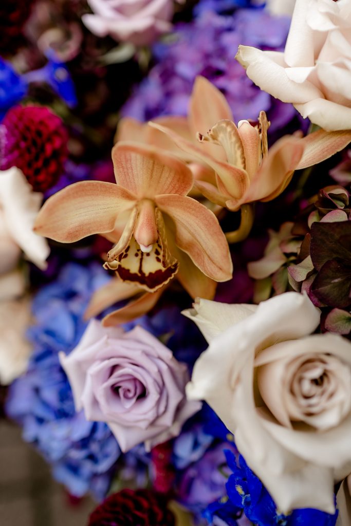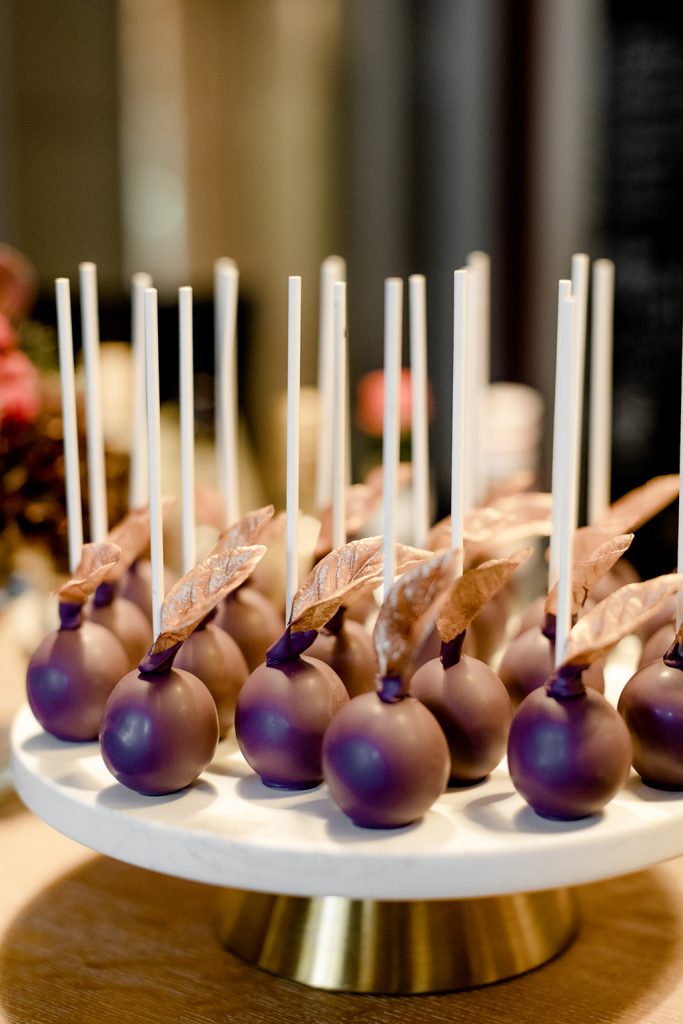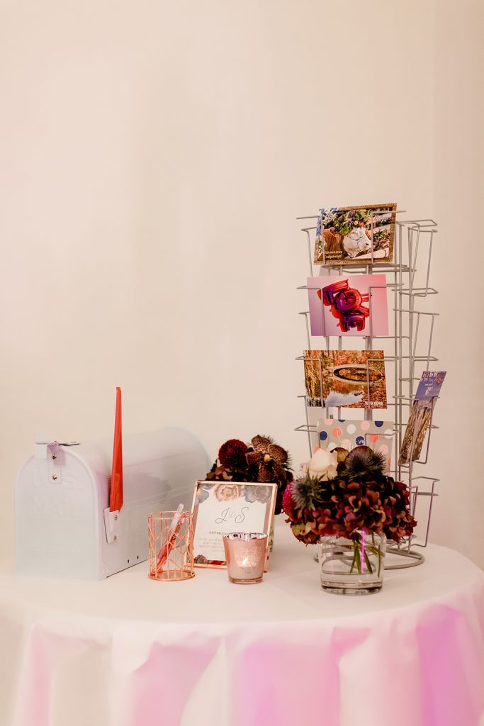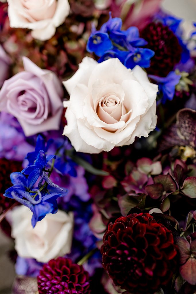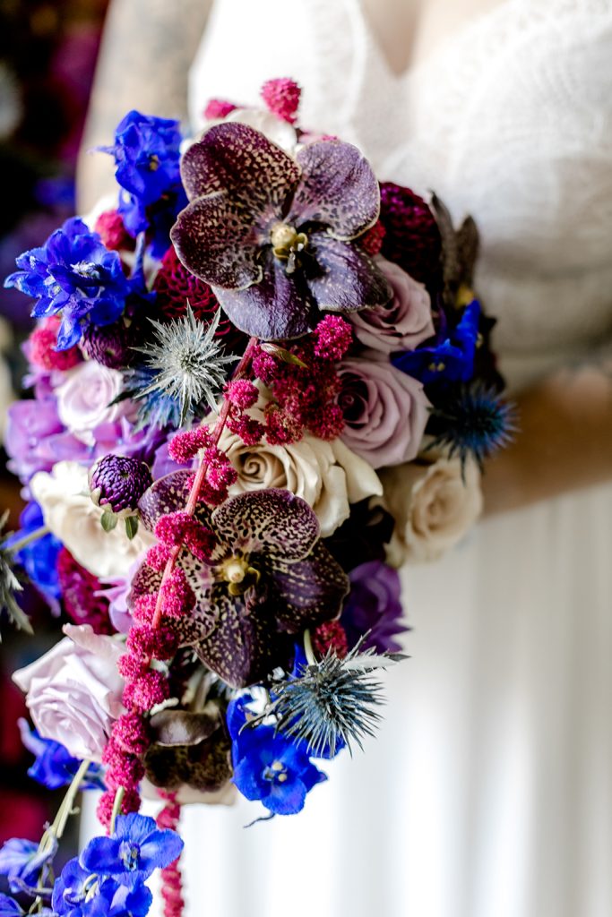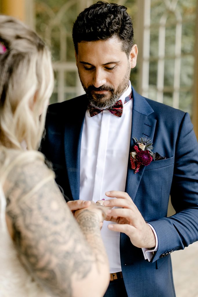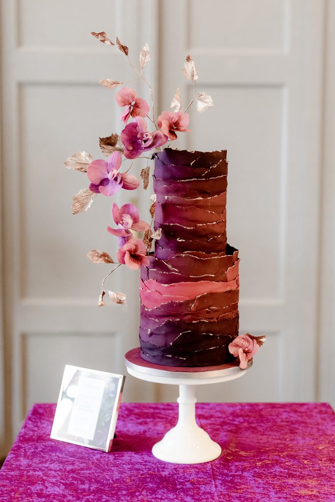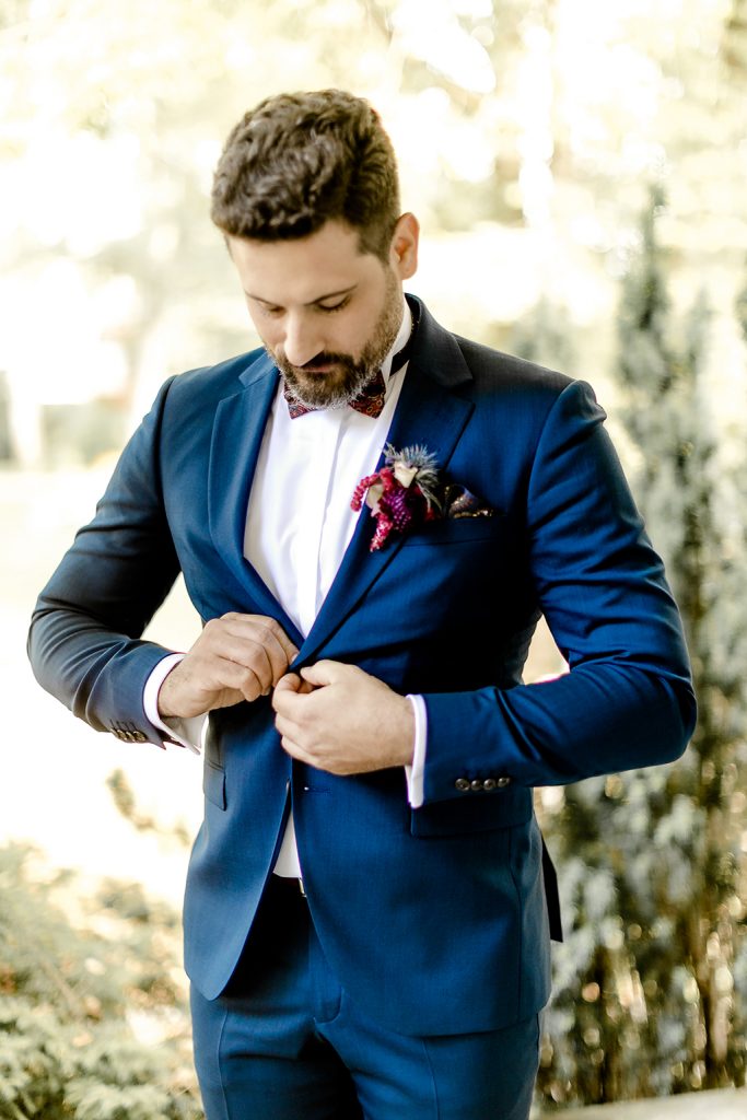 Nachdem die Location gefunden war, erstellte ich ein Konzept für die beiden, das ihren Wunsch nach einer herbstlichen und farbenfrohen Gestaltung, nach opulentem Glamour und kurzweiliger Unterhaltung zum Ausdruck brachte. Wir entschieden uns für eine Palette aus Beerenfarben für diese Herbsthochzeit. Um die Unterhaltung kümmerte sich am Nachmittag ein Schnellzeichner, der alle Gäste porträtierte (das Portrait war auch ein perfektes Gastgeschenk), ein Mentalist, der nach dem Hauptgang in einer 30-minütigen Show alle Gäste zum Staunen und Lachen brachte, und ein Saxophonist, der sogar auf dem Tisch spielte und tanzte und zusammen mit dem DJ das Publikum zum Kochen brachte. Ich habe noch nie eine Hochzeit mit relativ wenigen Gästen erlebt, bei der die Tanzfläche den ganzen Abend über so voll war.