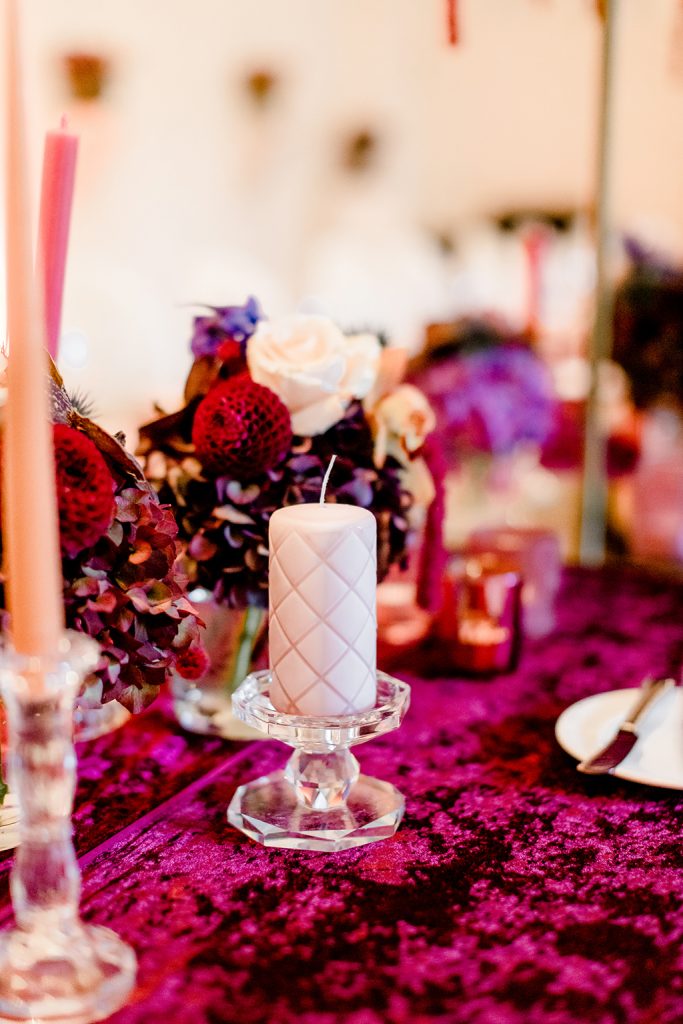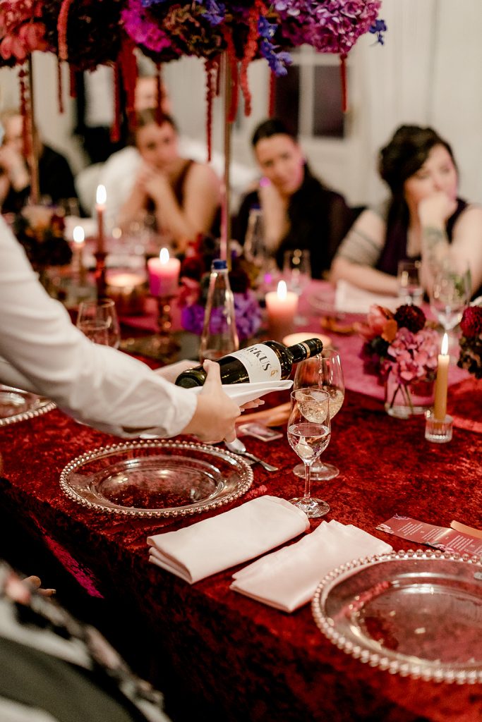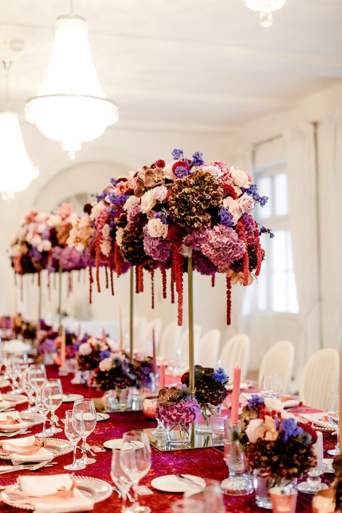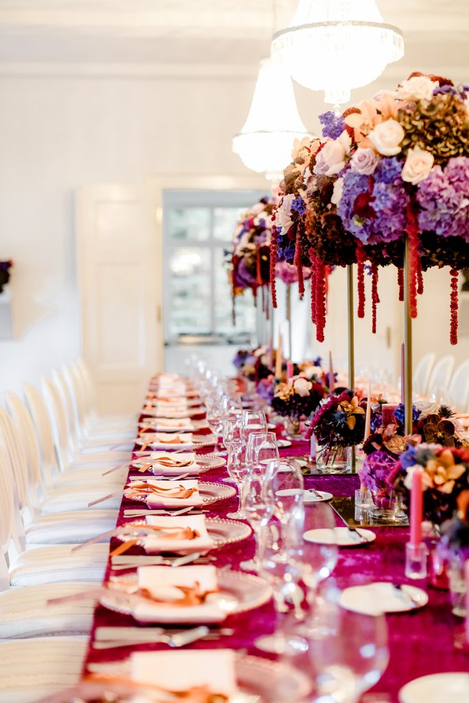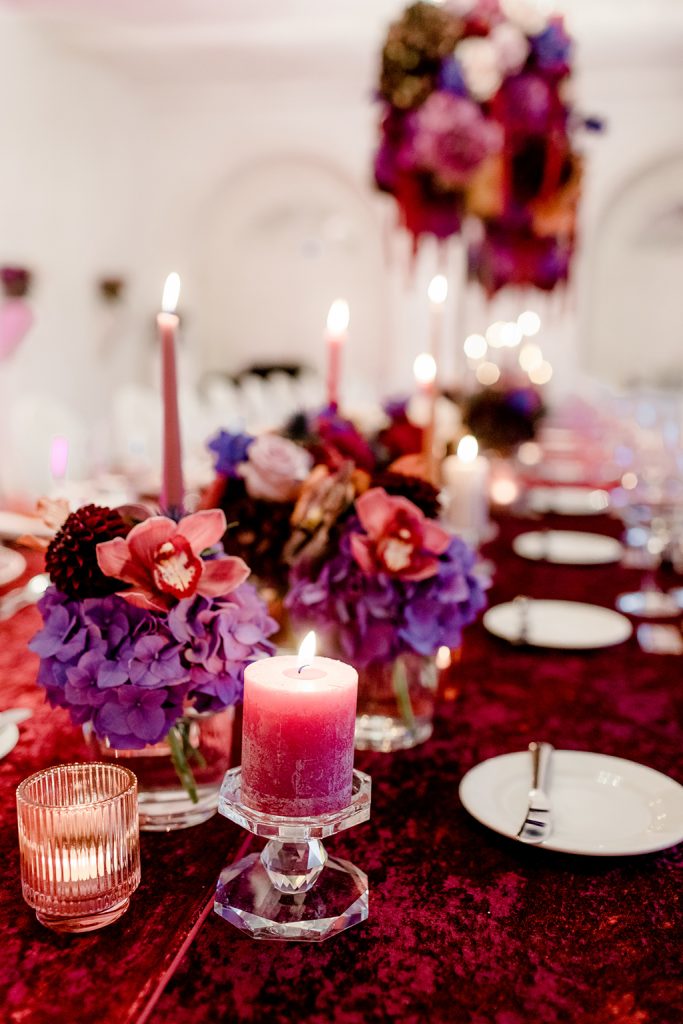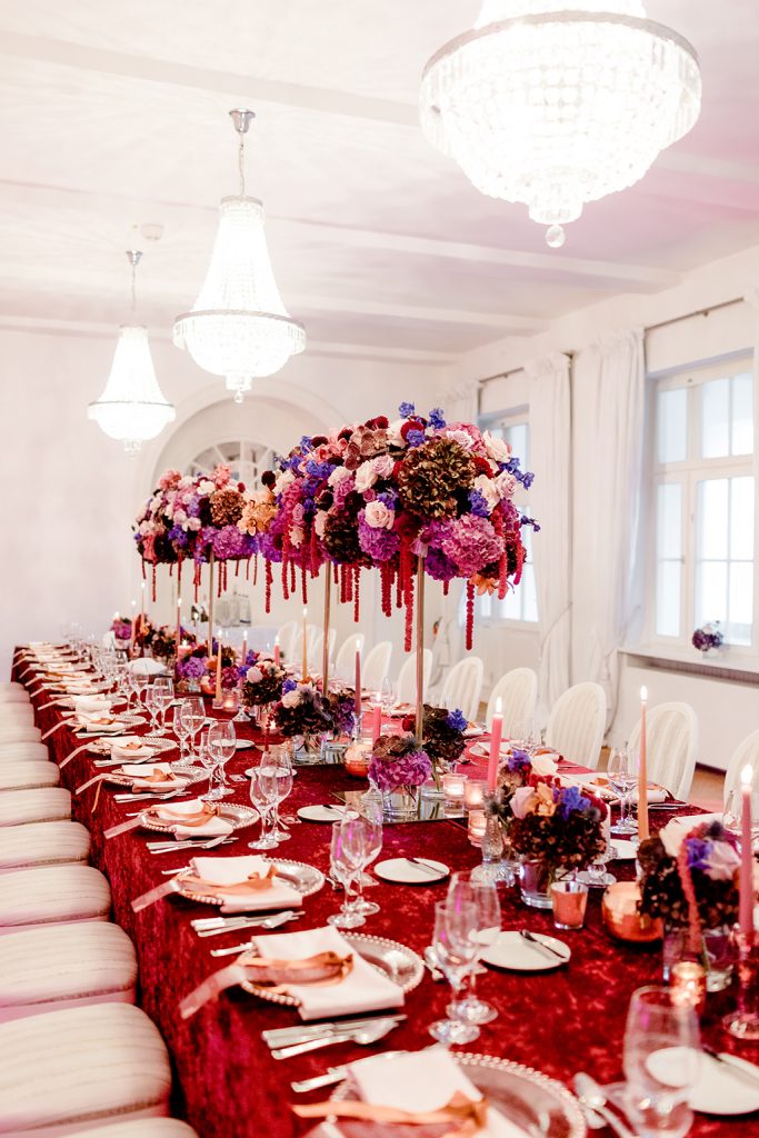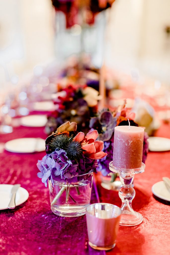 Janina & Sascha hatten mir bereits beim ersten Treffen mitgeteilt, dass sie gerne EINEN langen Tisch zum Abendessen hätten, an dem alle ihre Lieben Platz finden können. Selbstverständlich haben wir das auch umgesetzt und einen Banketttisch geschaffen, der seinem Namen alle Ehre macht. Hohe Blumenarrangements, beerenfarbene Samttischdecken, elegante goldene Servierteller aus Glas mit Perlenbesatz, Satinservietten, Acryl-Tischkarten mit Trockenblüten und eine Mischung aus extralangen Stabkerzen und Stumpenkerzen waren die Hauptelemente der dekorativen Gestaltung der Festtafel.