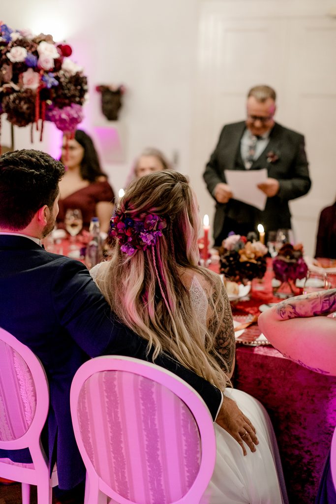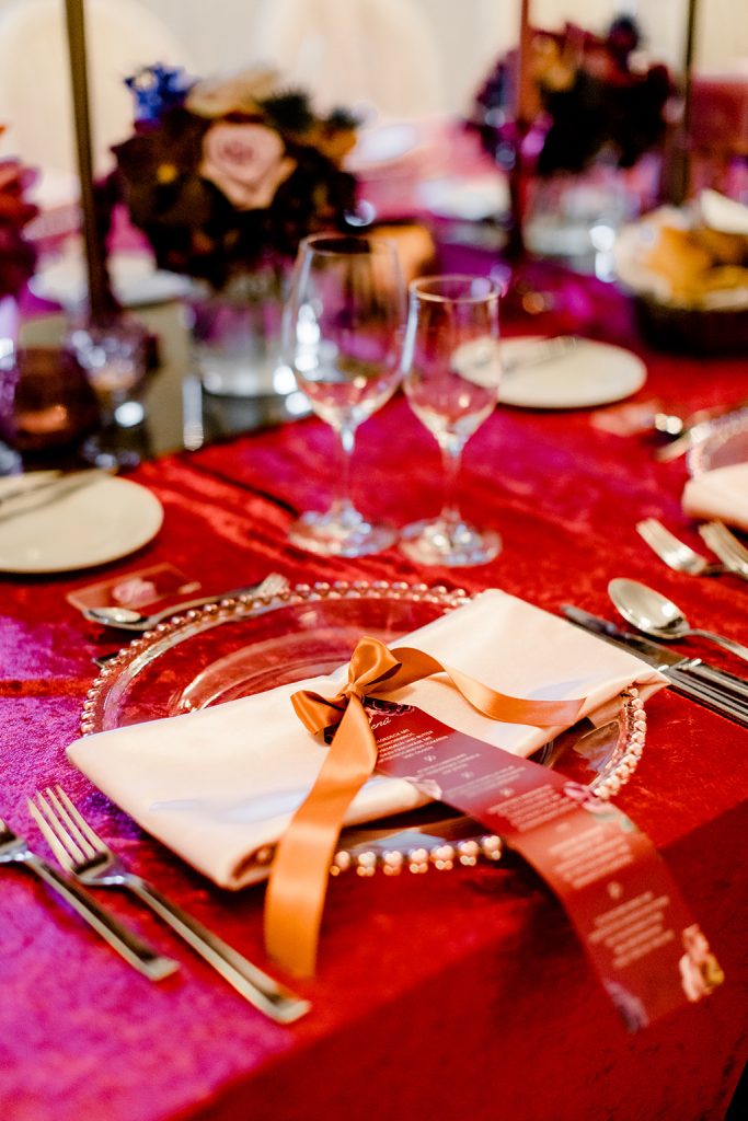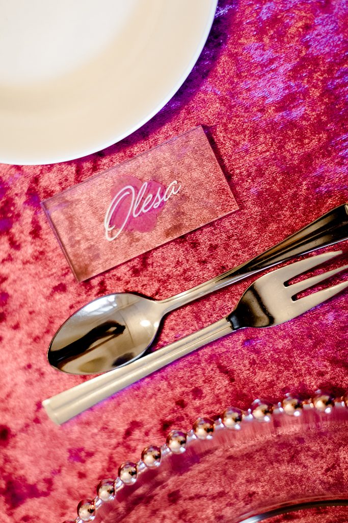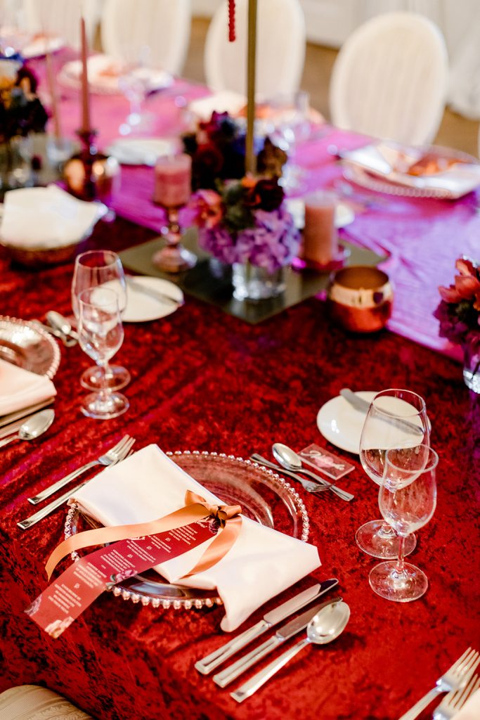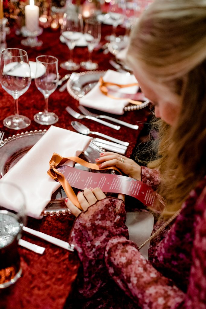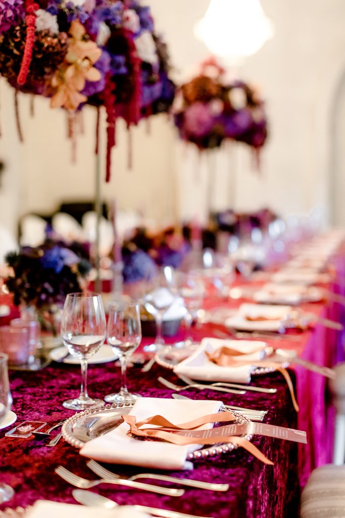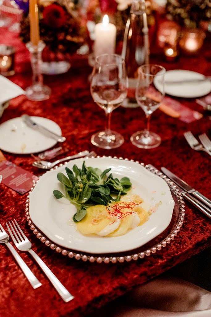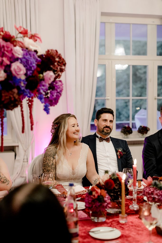 Janina & Sascha hatten mir bereits beim ersten Treffen mitgeteilt, dass sie gerne EINEN langen Tisch zum Abendessen hätten, an dem alle ihre Lieben Platz finden können. Selbstverständlich haben wir das auch umgesetzt und einen Banketttisch geschaffen, der seinem Namen alle Ehre macht. Hohe Blumenarrangements, beerenfarbene Samttischdecken, elegante goldene Servierteller aus Glas mit Perlenbesatz, Satinservietten, Acryl-Tischkarten mit Trockenblüten und eine Mischung aus extralangen Stabkerzen und Stumpenkerzen waren die Hauptelemente der dekorativen Gestaltung der Festtafel.
