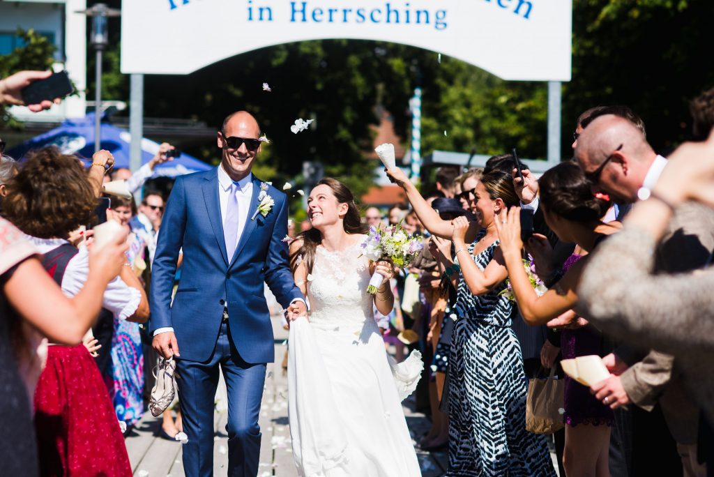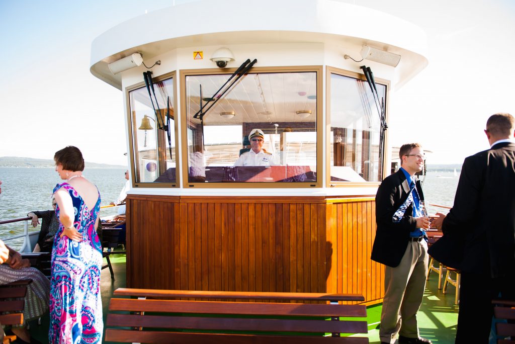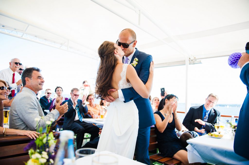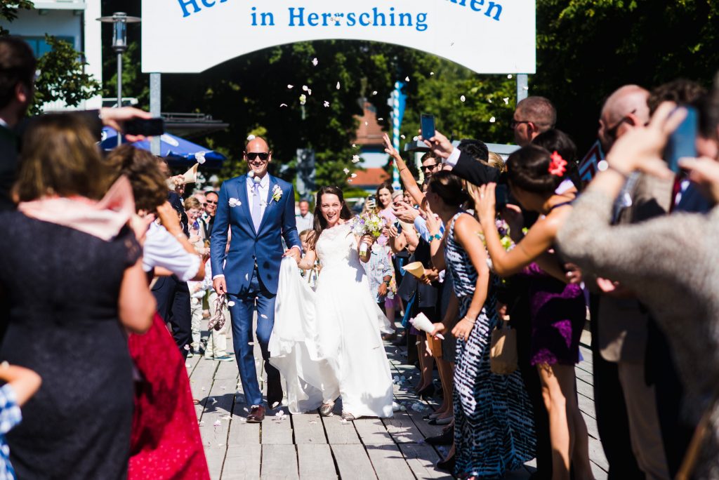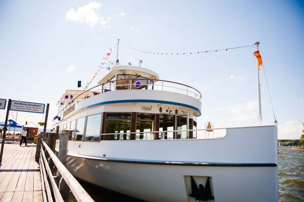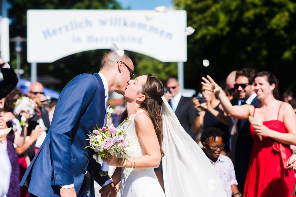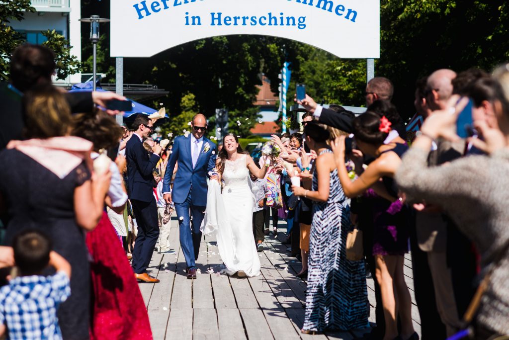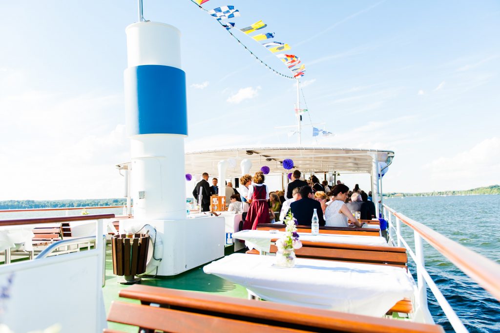 Die Hochzeit begann mit einer kirchlichen Zeremonie, die im malerischen Herrsching stattfand. Nach diesem emotionalen Höhepunkt führte der Weg der Hochzeitsgäste und des Brautpaares zur Schiffsanlegestelle in Herrsching. Von dort aus begab sich das Brautpaar unter Jubel der Gäste an Bord, gefolgt von der gesamten Hochzeitsgesellschaft und die Seerundfahrt auf dem glitzernden Ammersee konnte beginnen. Dafür haben wir übrigens eigens die MS Augsburg gechartert.
