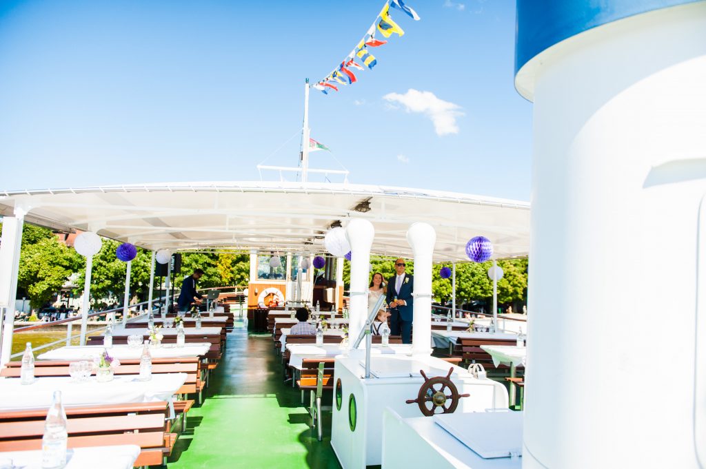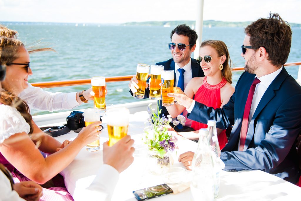 Während der Schifffahrt wurde den Gästen ein Sektempfang mit kühlen Drinks und deftigem Fingerfood serviert, begleitet von den coolen Chill-Out-Klängen eines DJs auf dem Deck. Die MS Augsburg legte schließlich in Stegen an, wo die festliche Feierlocation auf die Gäste wartete.