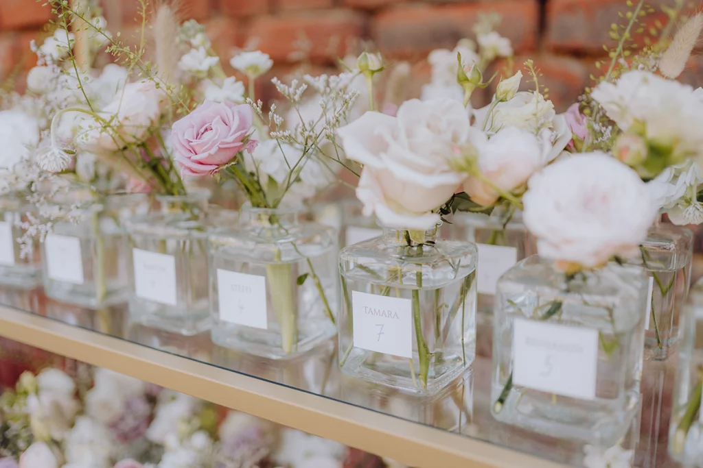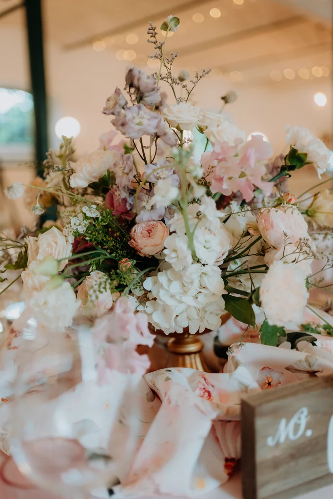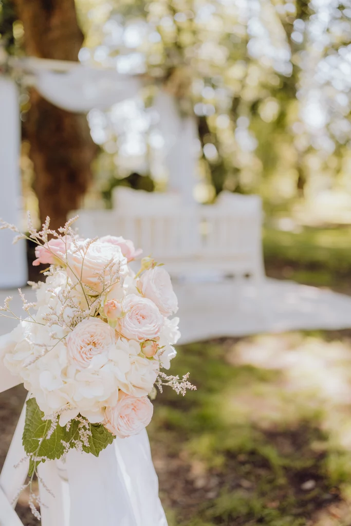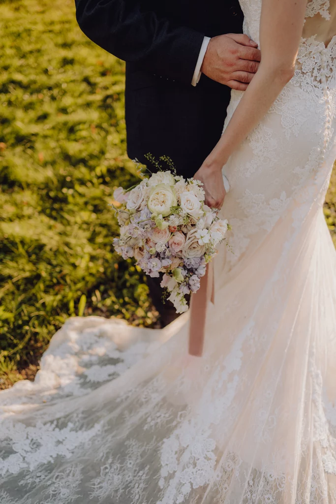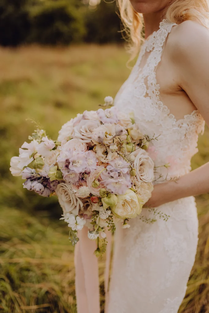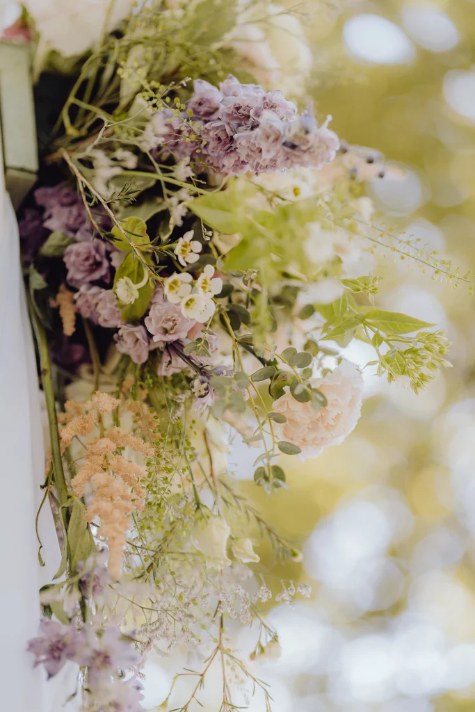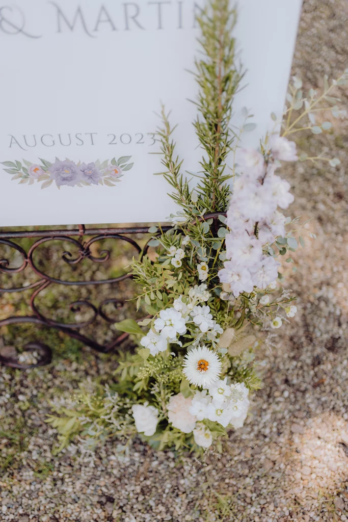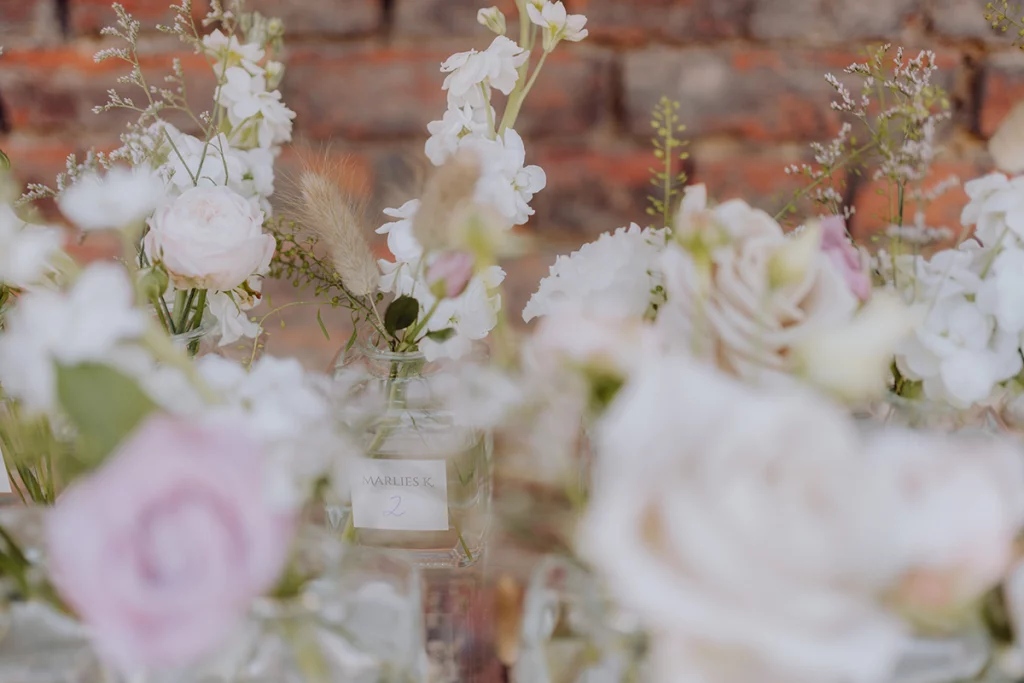 Und so war diese August-Hochzeit eine Hommage an die Englischen Gärten mit ihren verschlungenen Wegen, reicher Bepflanzung und den Blumendekorationen, die die üppige Blumenpracht eines Englischen Gartens widerspiegelten, wobei viel Grün in den Blumenarrangements für Frische und Lebendigkeit sorgte.