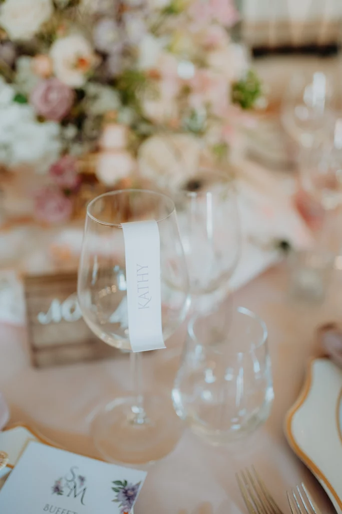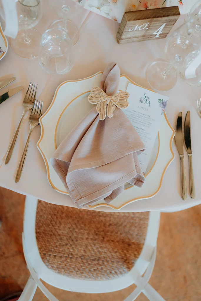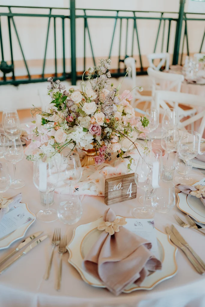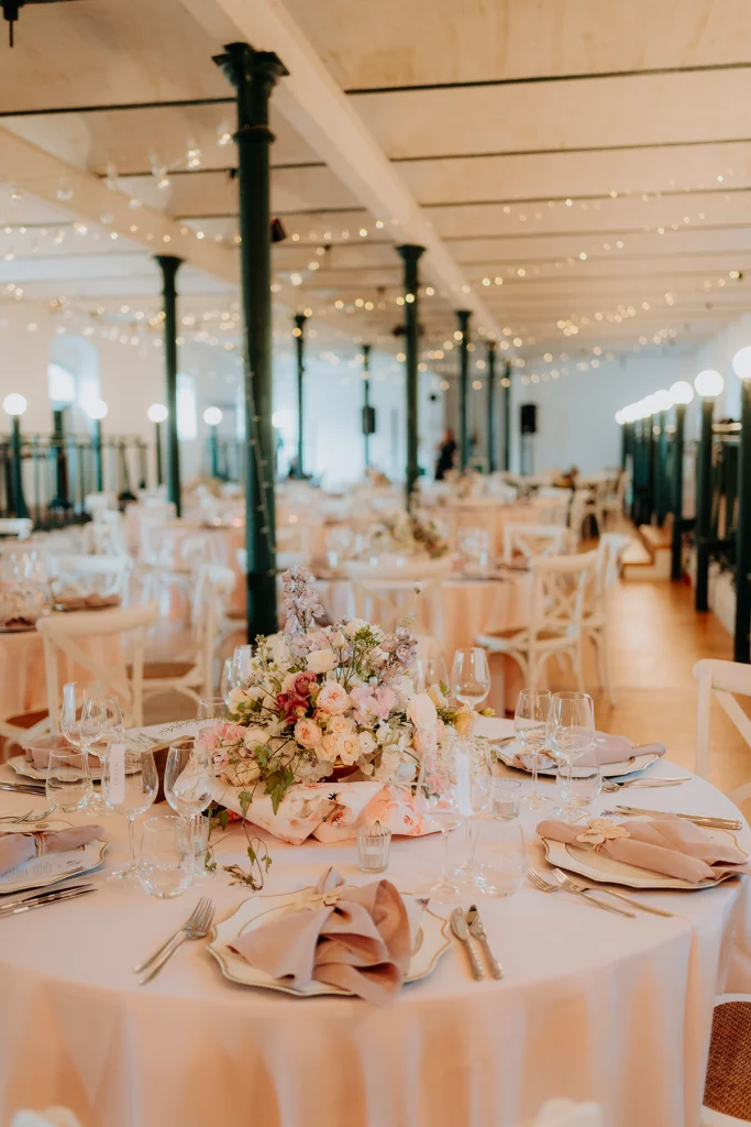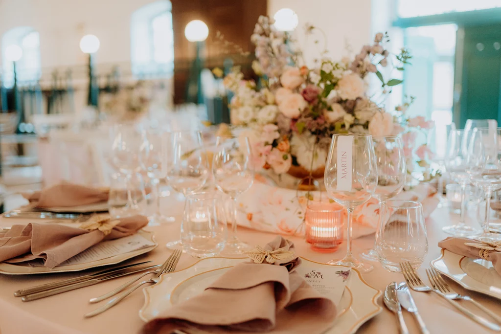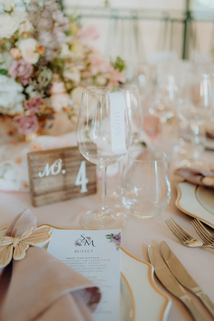 Die Tischdekoration, angelehnt an den charmanten Landhausstil, bezauberte mit Details wie den handgefertigten Schleifen, die als Serviettenringe fungierten und Tischwäsche in den zarten Pastellfarben und typisch englischen Blumenmuster.